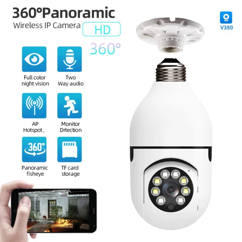 Тип Ip-камера Приложение V380 Высокое разрешение 1080P Объектив (мм) 3,6 мм Цвет Белый Сенсор CMOS Мегапиксели 2 МП Питание E27 Формат сжатия видео H.264 Подключение Ip/беспроводная сеть TF карта 128G TF карта (не входит в комплект) Угол обзора 360 ° (уровень)/90 ° (вертикальный) Протокол сетевого кабеля Wi-Fi/802,11/b/g Ночной режим Полноцветный светодиодный инфракрасный прибор ночного видения Поддерживаемые мобильные системы Android/ios Посылка включает в себя: Камера 1 Основание 1 Описание: