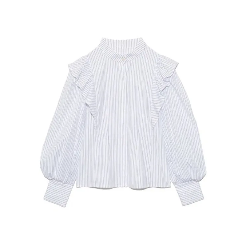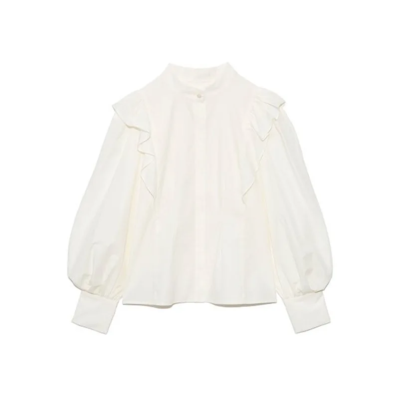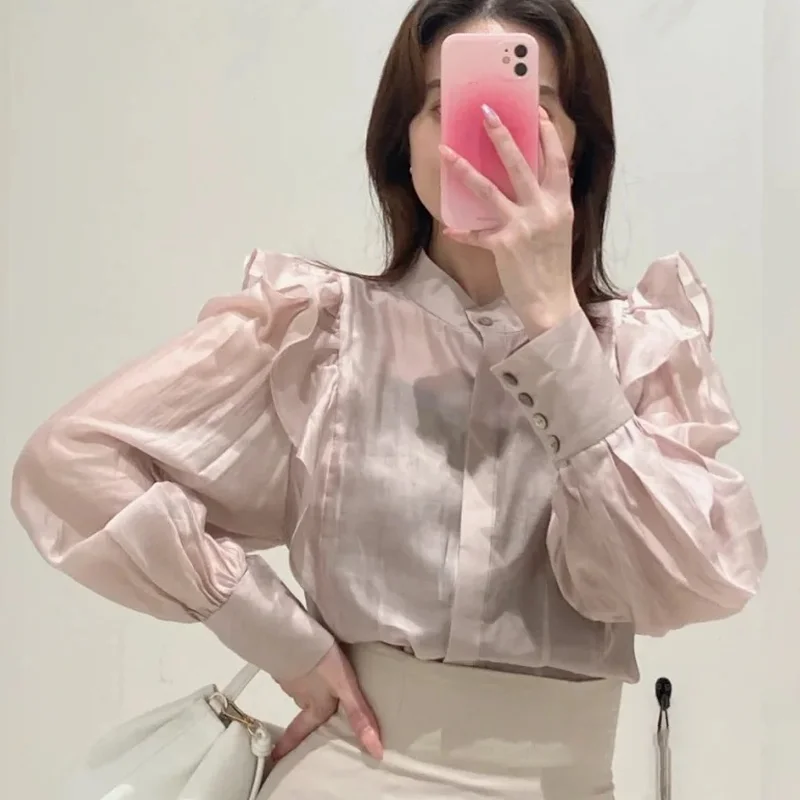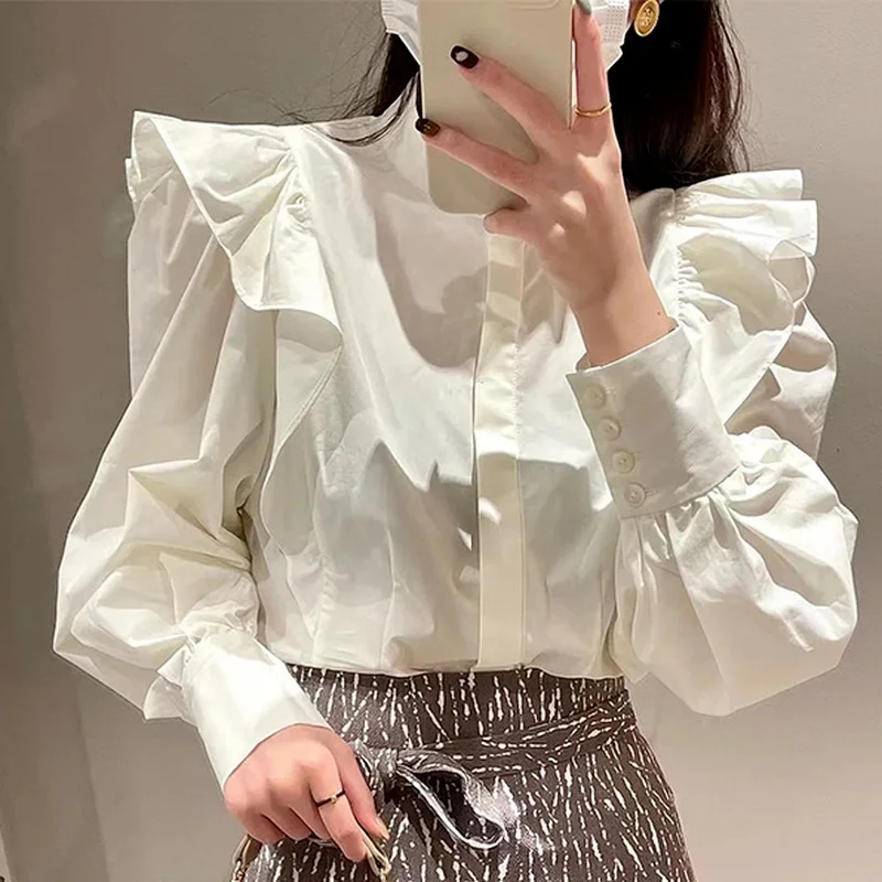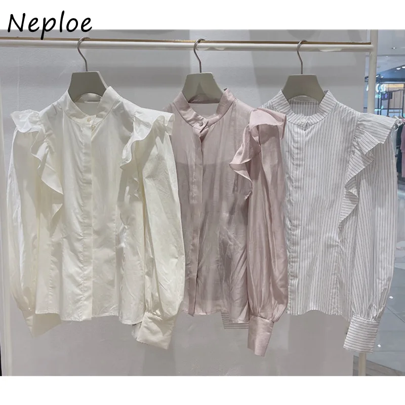 Японская блуза Neploe, новинка весны 2022, женские блузки, милая темпераментная однотонная блузка с воротником-стойкой, оборками и рукавами-фонариками, Прямая рубашка