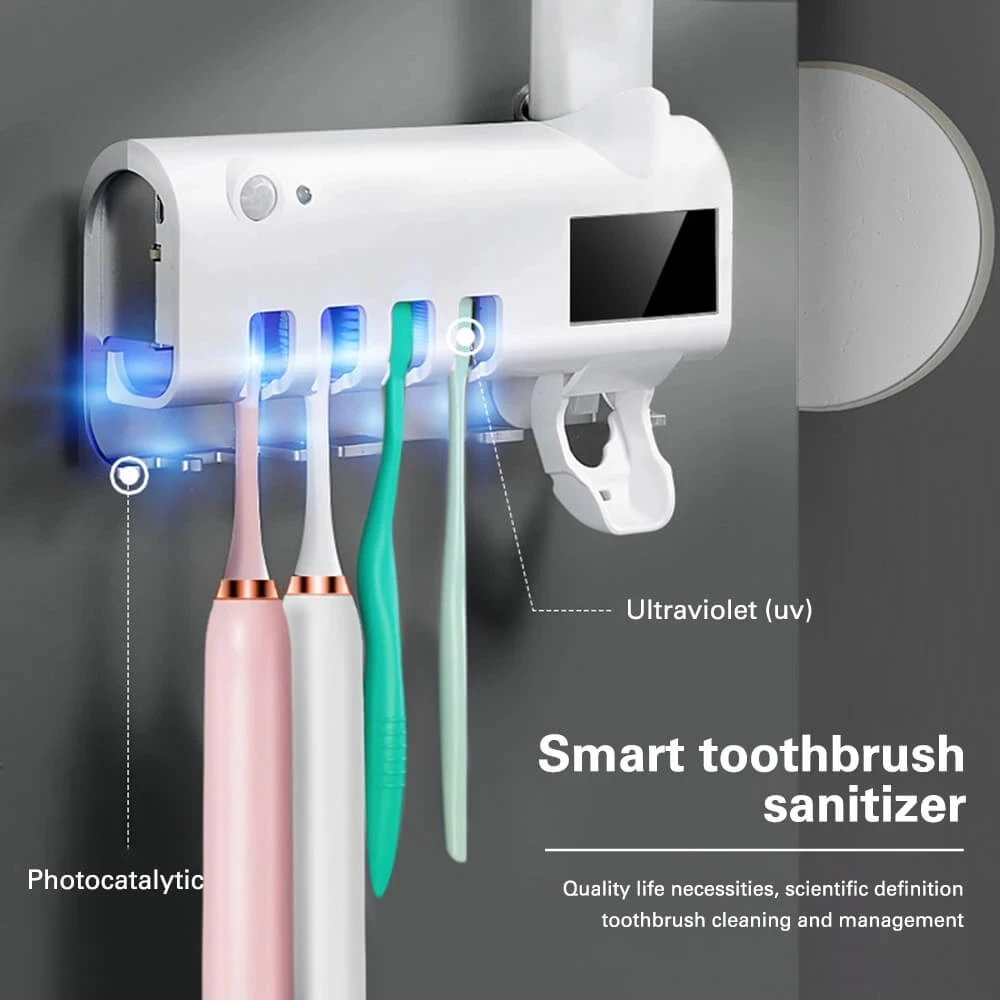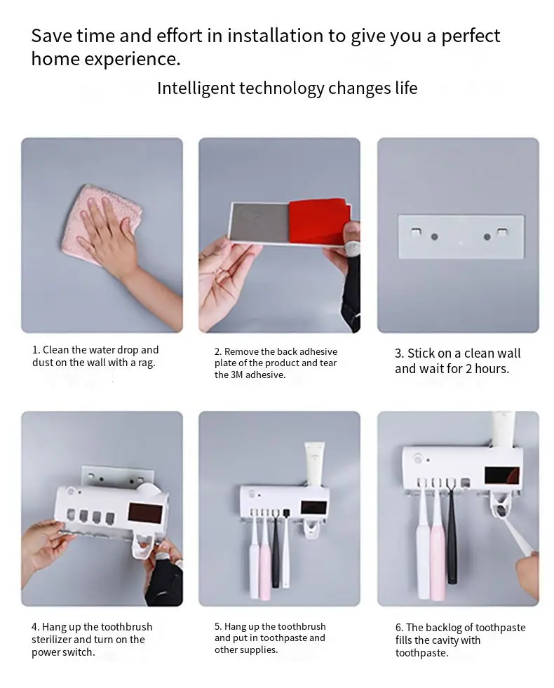 1. Очистите каплю воды и пыль на стене тряпкой.2. Удалите заднюю липкая пластина продукта и Оторвите 3 м клея.3. Приклейте к чистой стене и подождите 2 часа.4. Повесьте стерилизатор зубной щетки и включите выключатель питания.5. Повесьте зубную щетку и положите в зубную пасту и другие принадлежности.6. Зубная паста заполняет полость зубной пастой.