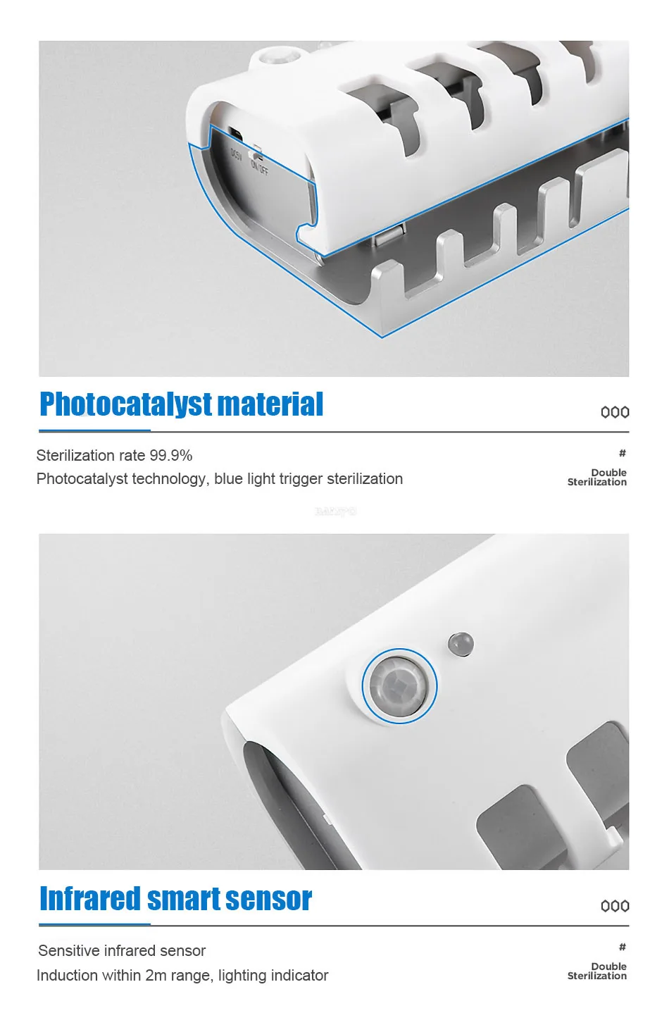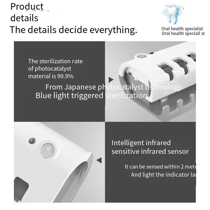 1. Стерилизатор ультрафиолетовой зубной щетки, фотокатализатор + ультрафиолетовая стерилизация, скорость стерилизации составляет 99.9%, Более Тщательная дезинфекция зубной щетки2. Двухслойная конструкция стерилизации, верхний слой может быть помещен в зубную щетку, нижний слой помещен в бритву, зубную нить и т. д. может дезинфицировать больше продуктов в то же время, высокая практичность3. Индукция инфракрасного света дезинфекции, когда люди близки к 1,5 метров, функцией стерилизации происходит автоматическое отключение4. Конструкция для хранения солнечной энергии, после USB зарядки, плата питания на солнечной батарее может Продлить Хранение электроэнергии без непрерывной зарядки, что удобно для экономии энергии5. Стерилизатор является водонепроницаемым и влагонепроницаемым, не протекает, безопаснее в использовании6. Коэффициент стерилизации составляет 99.9% # синий светильник, срабатывающий при стерилизации от японской технологии фотокатализатора. Интеллектуальный инфракрасный sensingO00Sensitive инфракрасный датчик # в пределах 2 м, он может ощущать и светильник индикатора. DoubleSterilization7. Размещение бактерий в разборах. Зубные щетки, подверженные воздействию воздуха во влажных условиях, подвержены образованию большого количества бактерий.