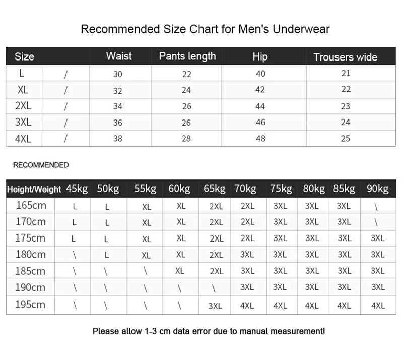Внимание:1. Это боксеры азиатского размера, пожалуйста, выберите правильный размер в соответствии с вашим ростом и весом.2. Азиатский размер на 2 размера меньше, чем США/Великобритания/RU/ЕС/размер.3. Пожалуйста, учитывайте разумную разницу в цвете из-за индивидуального монитора компьютера.