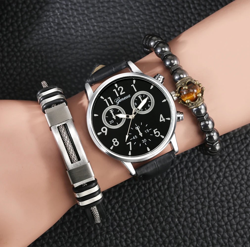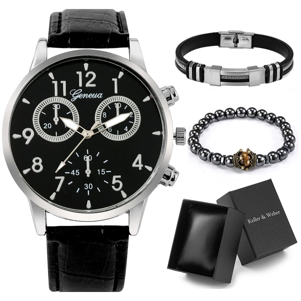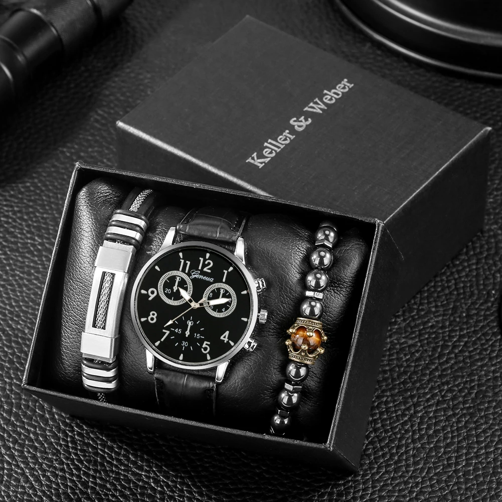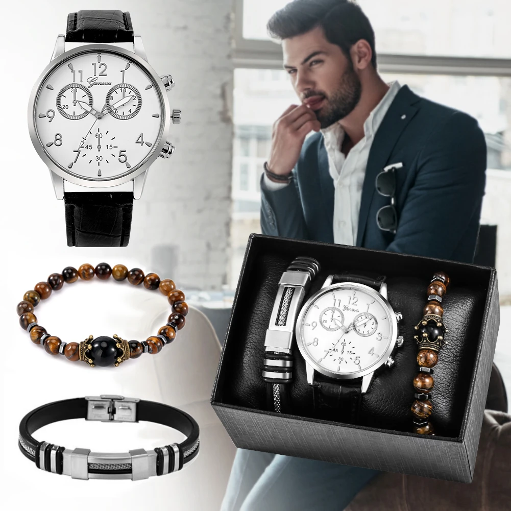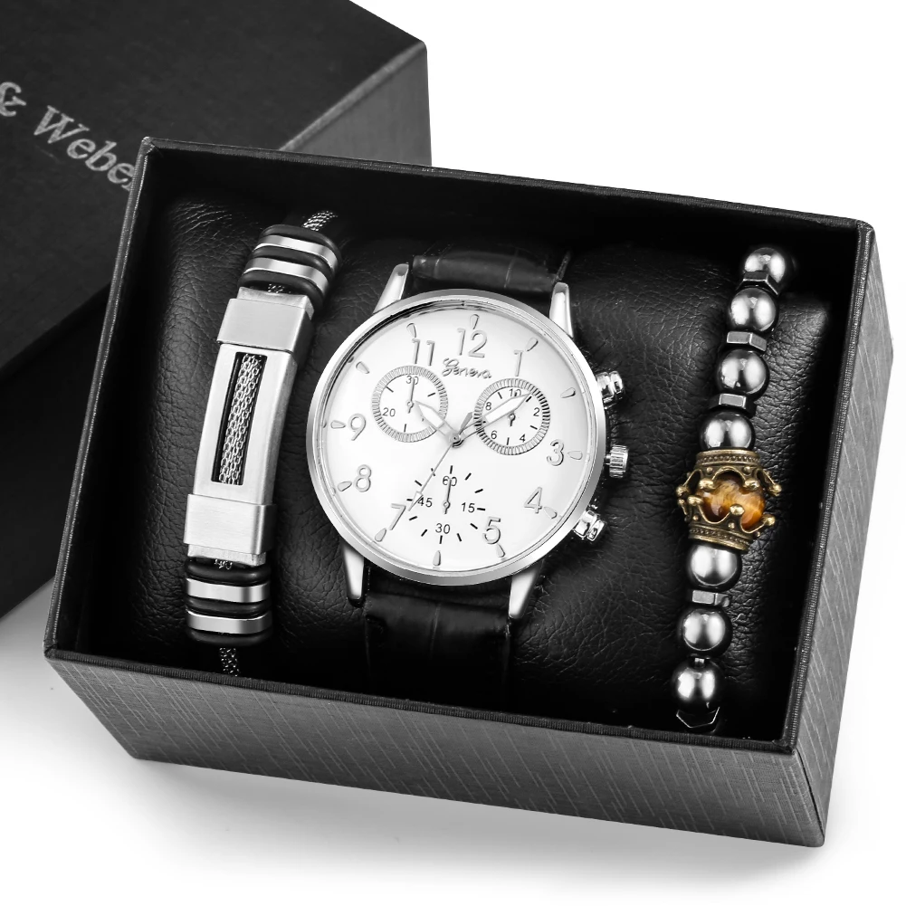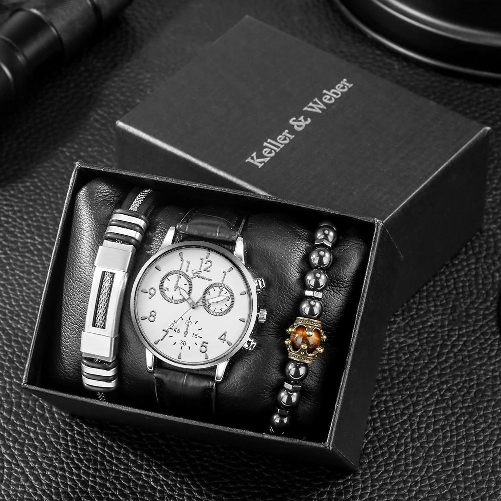 Новинка 2022, модный подарочный набор, мужские кварцевые часы с кожаным ремешком, 2 эластичных браслета, изысканный подарок на день Святого Валентина, комплект в коробке для парня