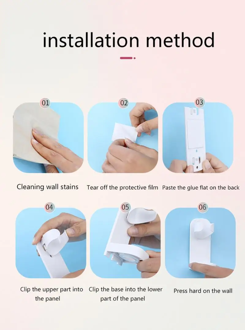 Как использовать: Очистите пыль и масло на стене, держите его сухим и взрывным, Оторвите защитную пленку клейкой ленты и Наклейте его на заднюю часть кронштейна, нажмите на него, чтобы разрядить излишки воздуха, вставьте ВЕРХНИЙ держатель в задний кронштейн, Нажмите на основание в задней скобе и прикрепите его к стене, плотно прижмите к лицу и дайте ему стоять в течение 24 часов перед использованием