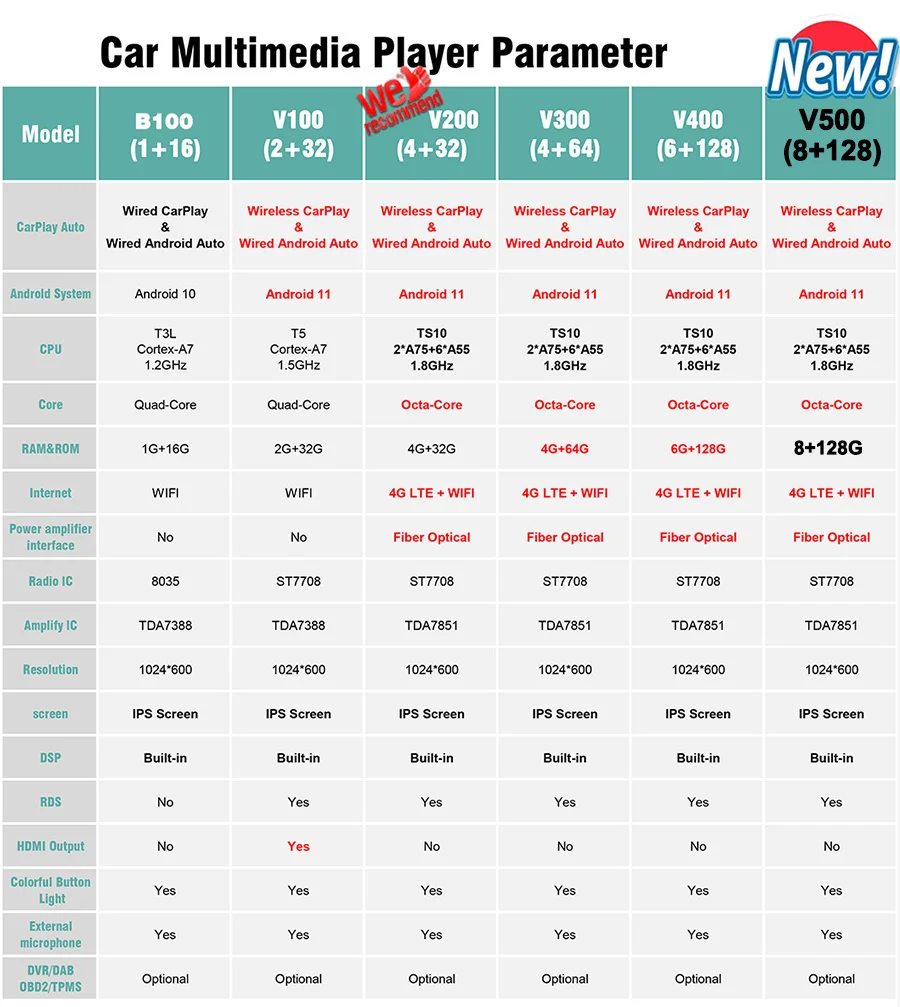 Параметры автомобильного мультимедийного плеераМодельB00(1 + 16)V100(2 + 32)V200(4 + 32)V300(4 + 64)V400(6 + 128)V500(8 + 128)CarPlay AutoПроводной CarPlayИПроводной Android AutoБеспроводной CarPlayИПроводной Android AutoБеспроводной CarPlayИПроводной Android AutoБеспроводной CarPlayИПроводной Android AutoБеспроводной CarPlayИПроводной Android AutoБеспроводной CarPlayИПроводной Android AutoАндролд системаAndroid 10Android 11Android 11Android 11Android 11Android 11ПроцессорT3LCortex-A71,2 ГГцT5Cortex-A71,5 ГГцTS102 * A75 + 6 * A551,8 ГГцTS102 * A75 + 6 * A551,8 ГГцTS102 * A75 + 6 * A551,8 ГГцTS102 * A75 + 6 * A551,8 ГГцСердечникЧетырехъядерный процессорЧетырехъядерный процессорВосьмиядерныйВосьмиядерныйВосьмиядерныйВосьмиядерныйОЗУ и ПЗУ1 г + 16 г2G + 32G4G + 32G4G + 64G6G + 128G6G + 128GИнтернетWIFlWIFl4G LTE + WIFl4G LTE + WIFl4G LTE + WIFl4G LTE + WIFlУсилитель мощностиИнтерфейсНетНетВолоконно-оптическийВолоконно-оптическийВолоконно-оптическийВолоконно-оптическийРадио lC8035ST7708ST7708ST7708ST7708ST7708Усиленный lCTDA7388TDA7388TDA7851TDA7851TDA7851TDA7851Разрешение1024*6001024*6001024*6001024*6001024*6001024*600ЭкранЭкран IPSЭкран IPSЭкран IPSЭкран IPSЭкран IPSЭкран IPSDSPВстроенныйВстроенныйВстроенныйВстроенныйВстроенныйВстроенныйRDSНетДаДаДаДаДаВыход HDMIНетДаНетНетНетНетЦветная кнопкаСветильникДаДаДаДаДаДаВнешнийМикрофонДаДаДаДаДаДаВидеорегистратор/DABOBD2/TPMSОпциональноОпциональноОпциональноОпциональноОпциональноОпционально