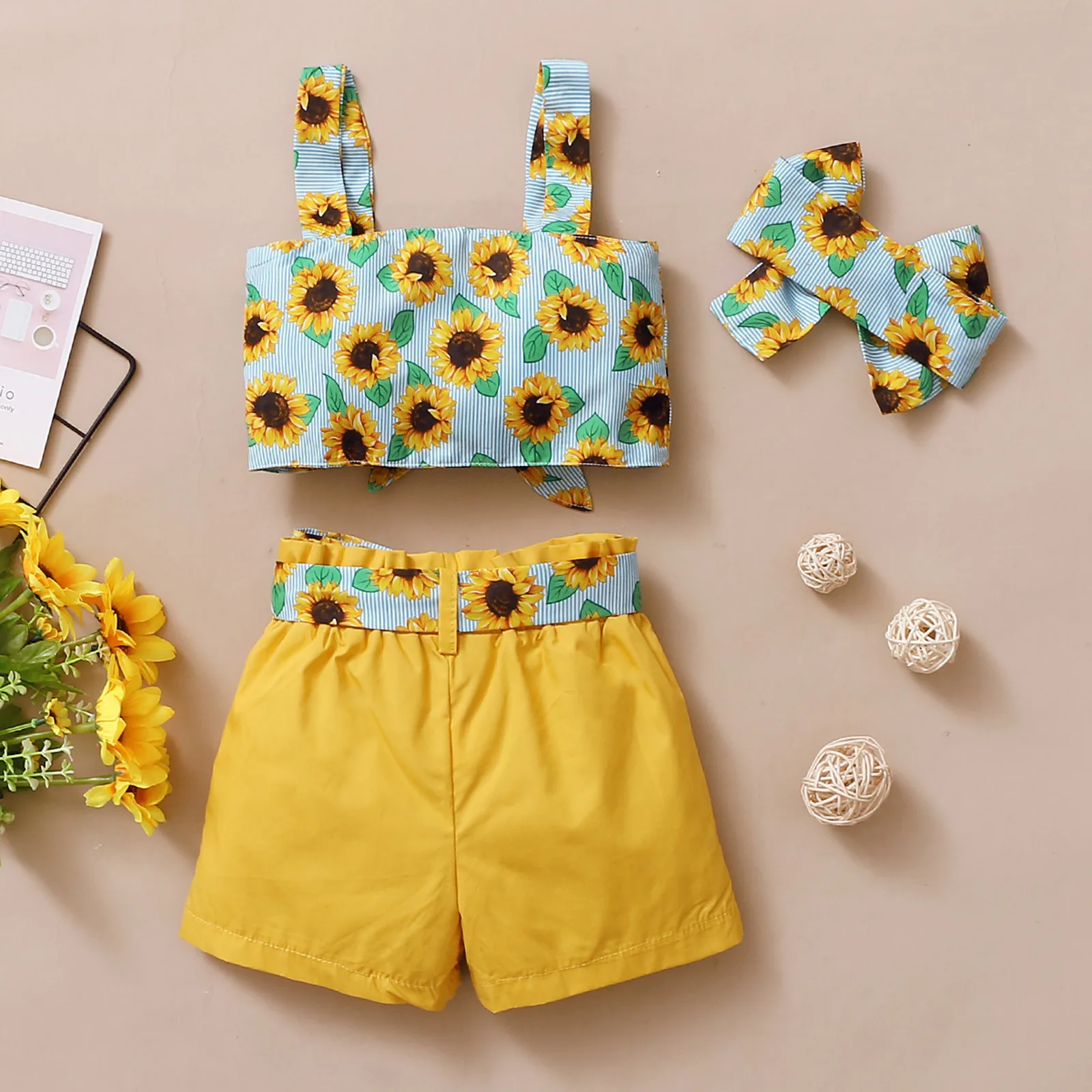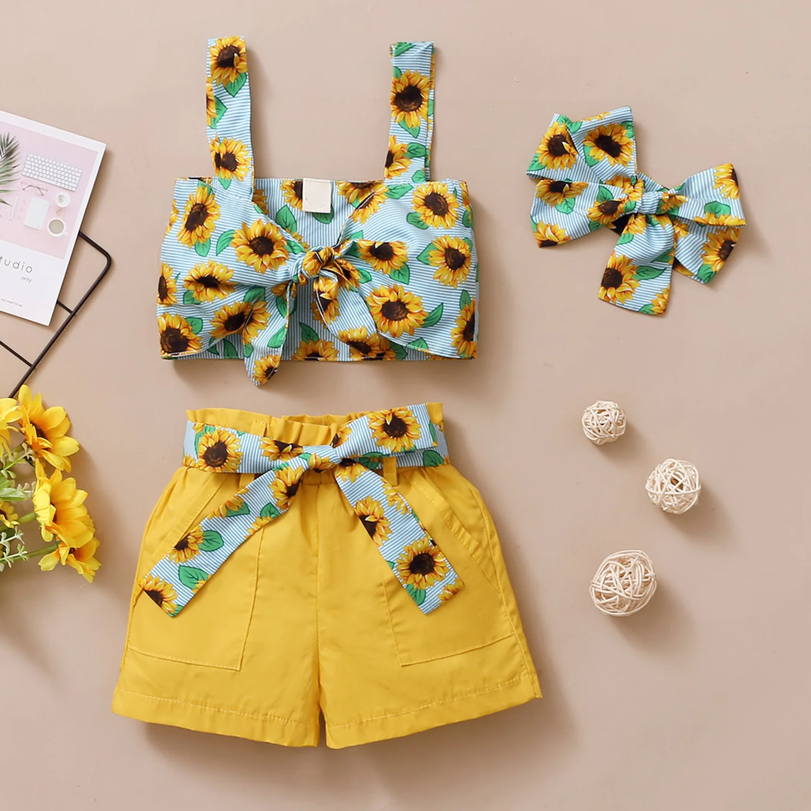 Летняя одежда для маленьких девочек 1, 2, 3, 4 лет, топ на бретельках с бантом в виде подсолнуха + шорты + повязка на голову, комплект из 3 предметов, детская одежда, одежда для девочек