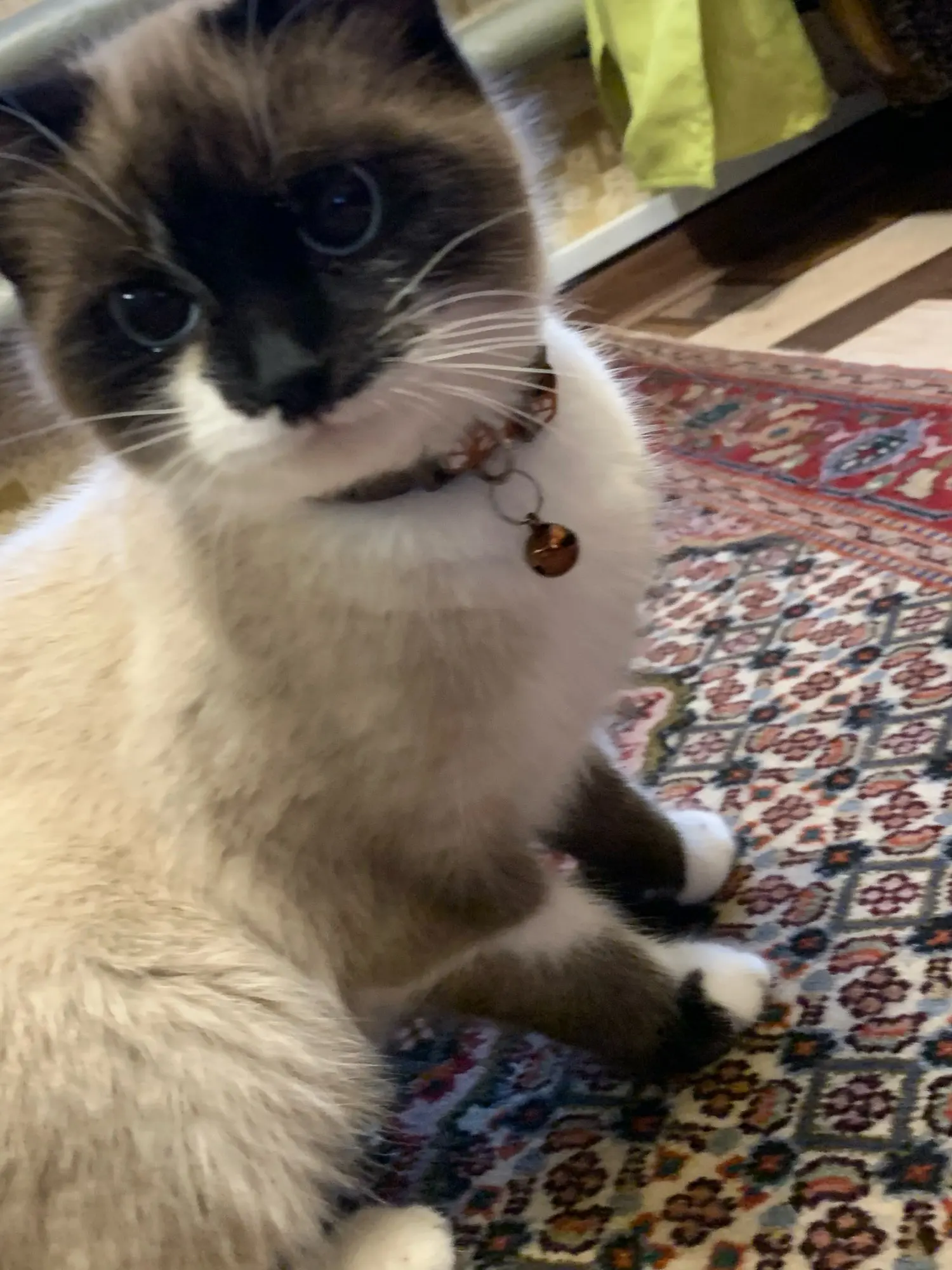 цвет,как заявлен,колокольчик звенит,кошка не много в шоке была,пыталась снять,потом ничего,попривыкла.Колокольчик немного в еде утонул,на ночь сняли.