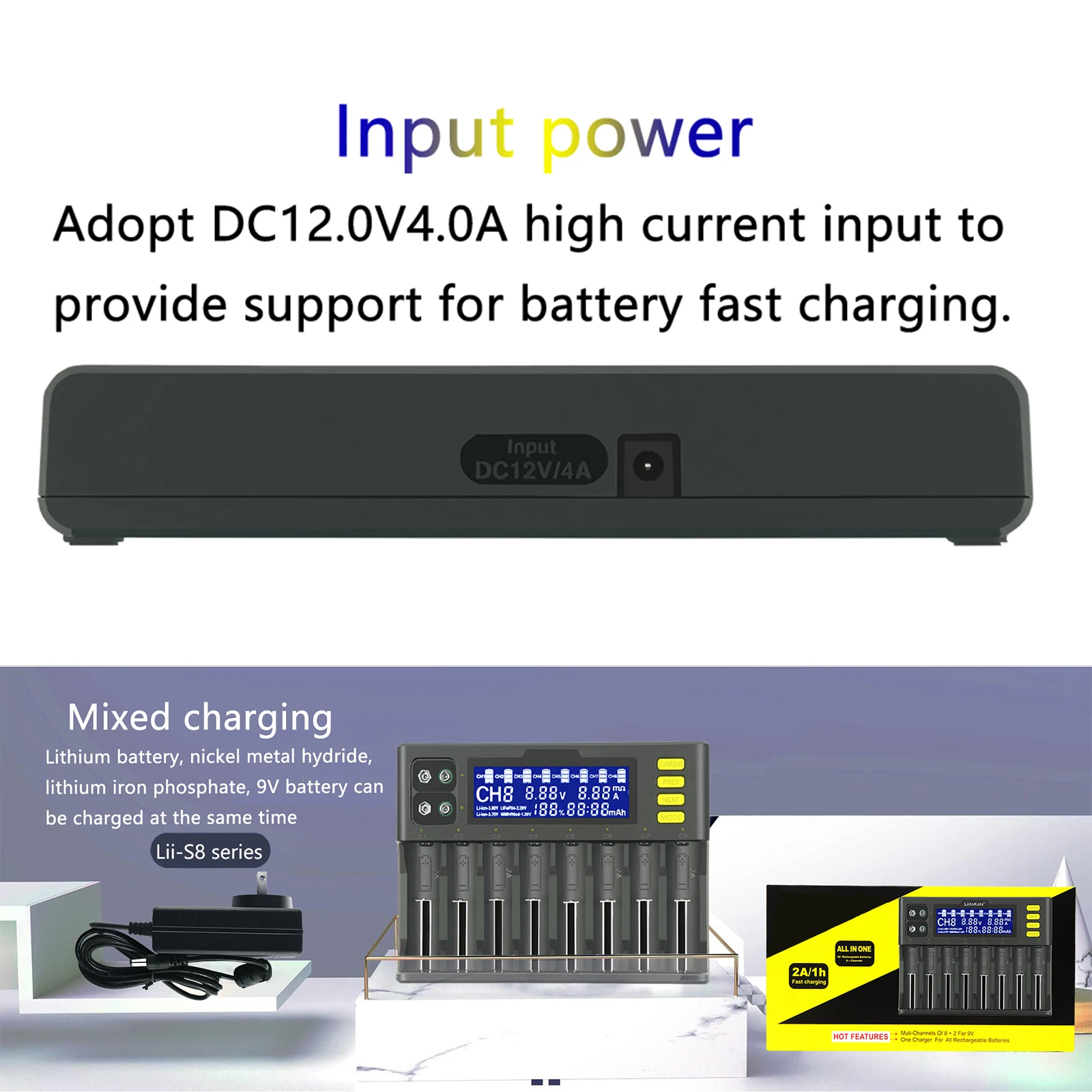 Особенности: Вы можете заряжать различные типы батарей одновременно. Подходит для батарей Li-Ion (литий-ионных) 3,7 V/литий-ионный аккумулятор 3,8 V / Li-FePO4 3,2 V/никель-металл-гидридного 1,2 V батареи. Lii-S8 зарядное устройство проверит сопротивление батареи и автоматически распределит зарядный ток. Он также может быть выбран вручную с помощью текущей кнопки. Он может держать 8 21700 батарей одновременно. Более того, каждый из 8 слотов может получить зарядный ток 1000 мА. Только при зарядке 4 аккумулятора, #1, #3, #6, #8 слот может получить выход 2A. Он может заряжать 2 батареи 9 В одновременно. Характеристики: Входное напряжение: 12 В/4 а постоянного тока Выходное напряжение: DC 4,2 V для li-ion DC 4,35 V для IMR DC 3,65 V для LiFePO4 DC 1,48 V для NiMH/NiCd 9 В постоянного тока для NiMH Выходной ток: Li-ion/IMR/LiFePO4: 2000mA * 4 (только слот #1/3/6/8) / (300mA / 500mA / 700mA / 1000mA)* 8 NiMH/NiCd: 500 мА * 8 9 в NiMH-9V: 85мА * 2 Характеристики аккумуляторной батареи: 26650,21700,20700,18650,18350, 18490, 17670, 17500, 16340, 14500, 10440, AA, AAA, C,SC 9V и т. д. Зарядное устройство Размер: 19,5*14*3,8 см/7,7*5,5 * 1.5in Размер посылка: 29,5*15,2*5,8 см/11,6*6 * 2.3in Вес посылка: 742 г/26,2 унций Посылка: 1 * зарядное устройство 1 * Адаптер питания (опционально США/ЕС)