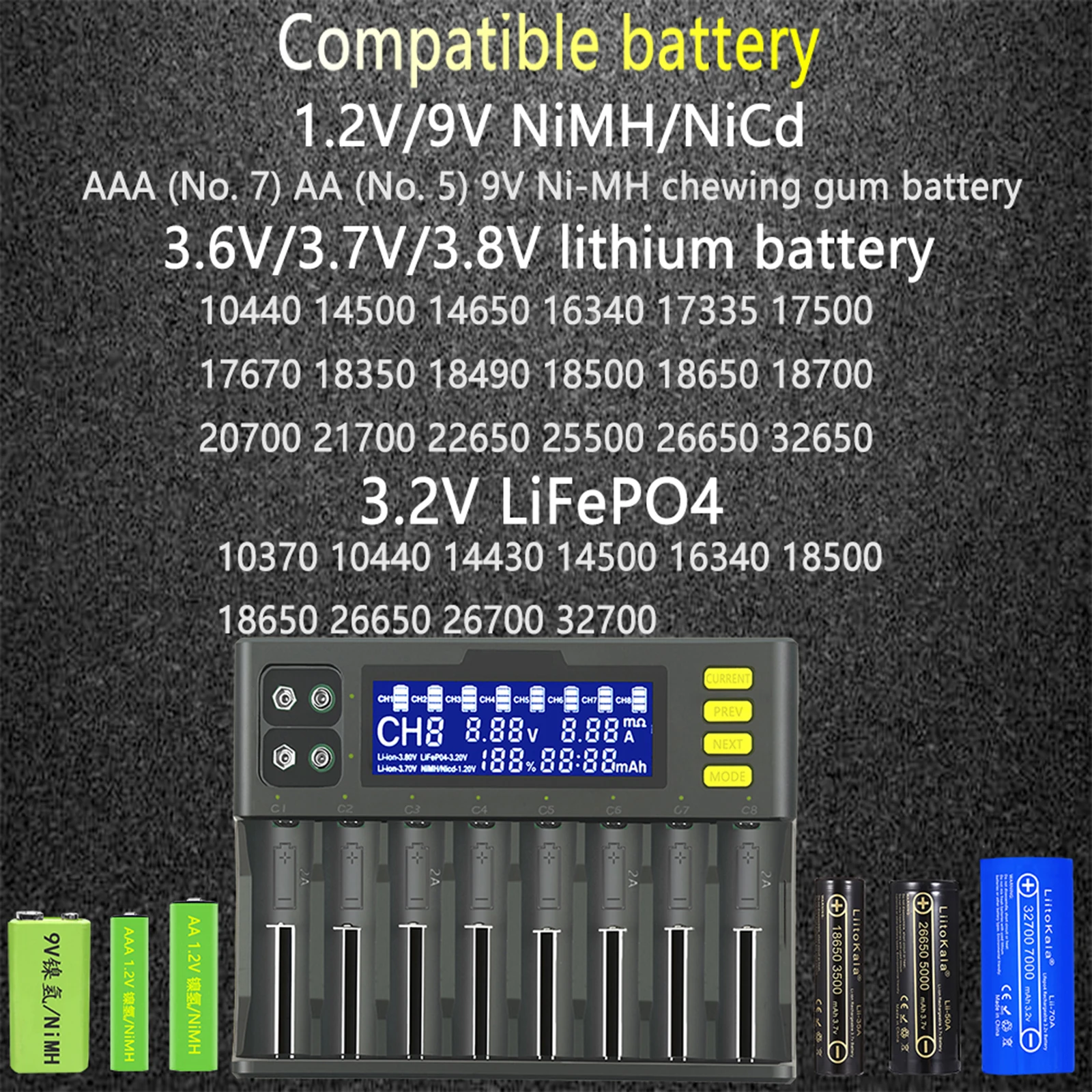 Зарядное устройство LiitoKala для аккумуляторов 18650, 8 ячеек, ЖК-дисплей, для li-ion, LiFePO4, Ni-MH, Ni-Cd, 9 В, 21700, 20700, 26650, 26700, 10370, 18700, AA, AAA