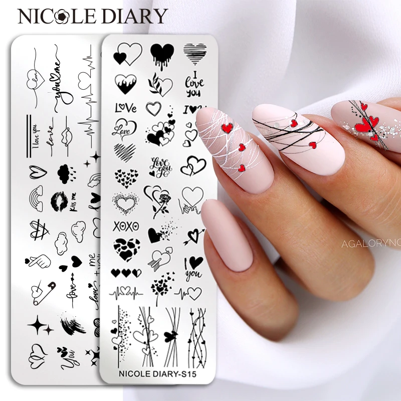 Трафареты NICOLE DIARY для стемпинга ногтей в полоску, сердце, любовь, День Святого Валентина, трафареты для стемпинга ногтей, лист, цветок, маникюр, Декор