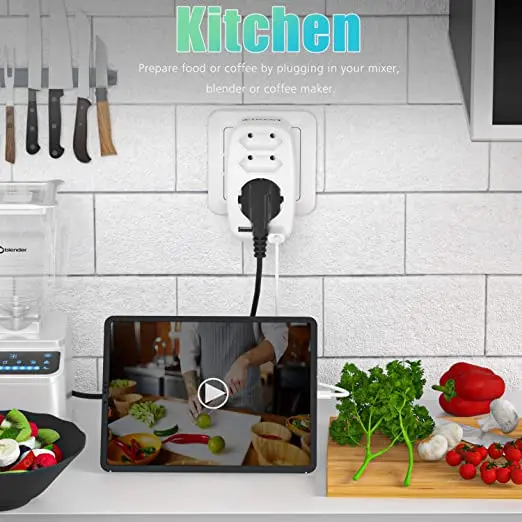 1. 5 в 1 дизайн: 1 AC Schuko розетка и 2 евро розетка + 2 USB порта. Контактная розетка AC Schuko: Максимальная мощность до 4000 Вт (макс. 250 В, 16А). Вход напряжение USB Порты и разъёмы s: 100V-250 В переменного тока, 50/60 Гц, 0.3A, напряжение на выходе USB: 5 В постоянного тока/2.4A (всего) 5V DC / 2.4A (один порт) эти usb-порты совместимы практически со всеми usb-устройствами, такими как iPhone11, XS Max, Xs, Xr, X, 8, 7, 6 Plus и SamsungGalaxy S10, S9, S8, Plus, S7, Note 10/9/8/7, LG V20/V30/G7/G6/G5, Google Pixel 3/2 & XL и т. д.