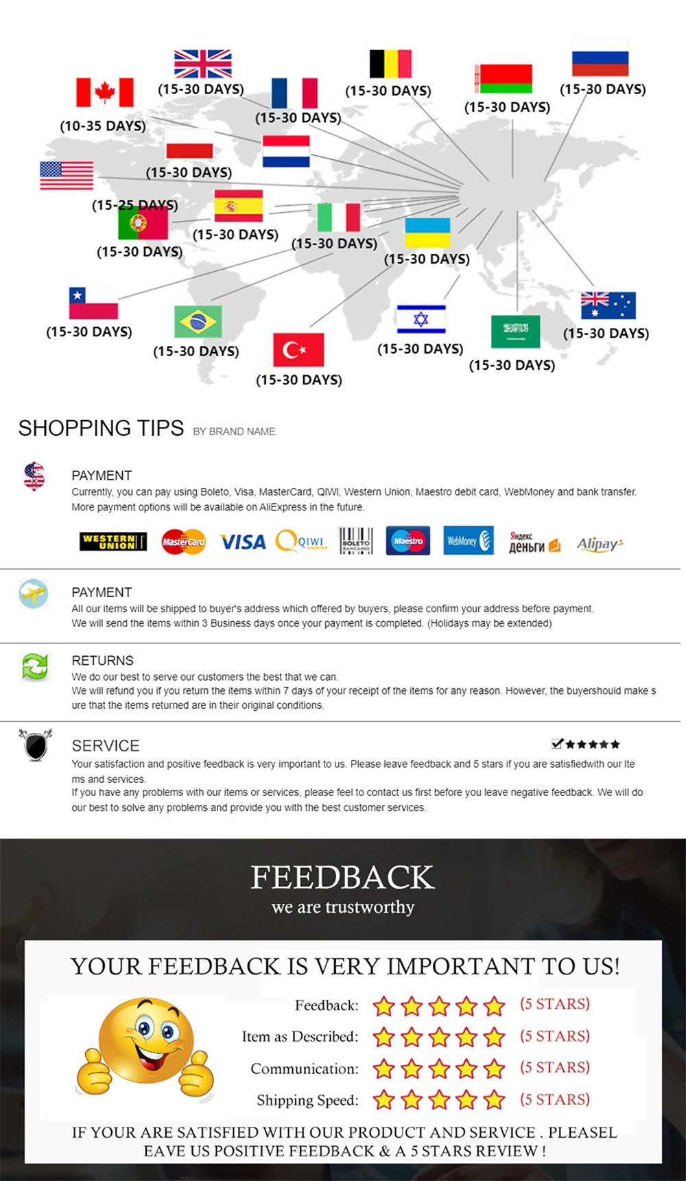 3. Пожалуйста, свяжитесь с нами, прежде чем открывать спор или оставить нам комментарий с низкой звездой. Так как свяжитесь с нами напрямую, это лучший способ найти решение, чтобы Вы остались довольны. Мы делаем все возможное, чтобы сделать каждого клиента счастливым.