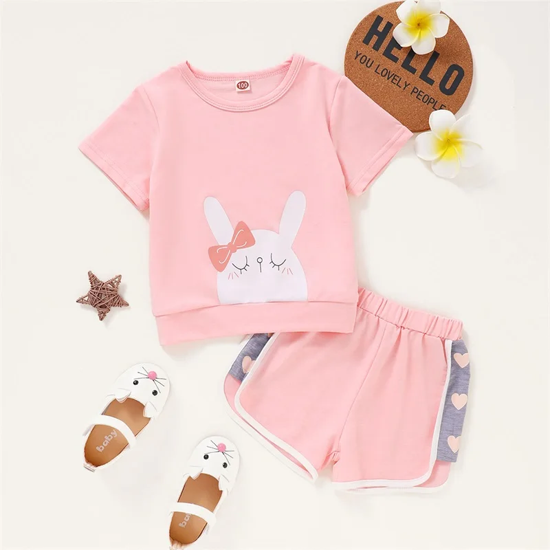 Летняя одежда для маленьких девочек, топы с коротким рукавом и мультяшным принтом кролика, футболка с принтом сердечек, шорты с эластичной талией, пасхальный наряд