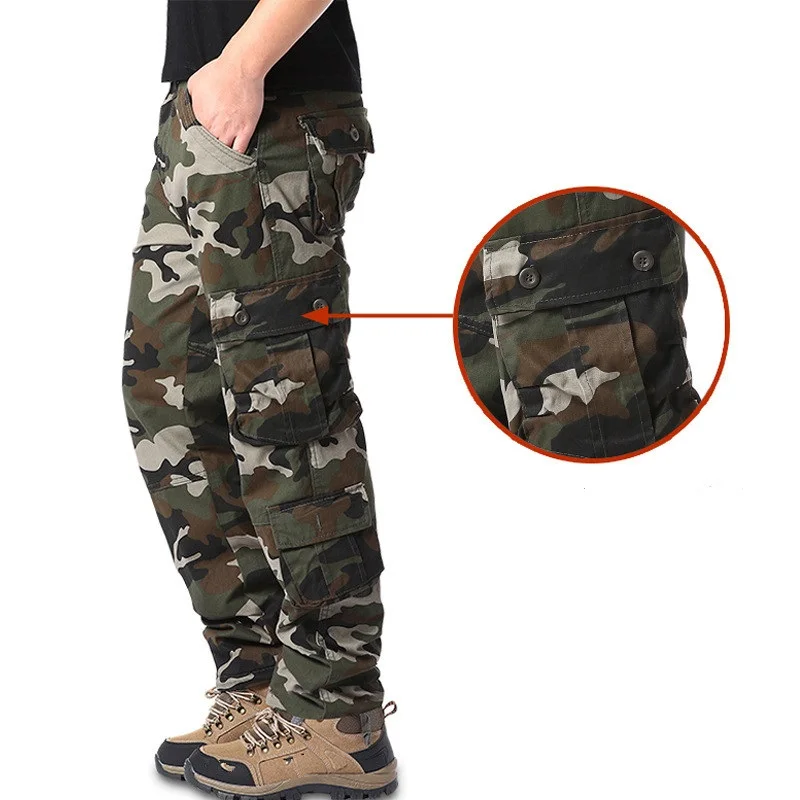 Мужские камуфляжные брюки-карго в стиле милитари, повседневные хлопковые мешковатые брюки со множеством карманов, уличная одежда, тактические прямые армейские брюки
