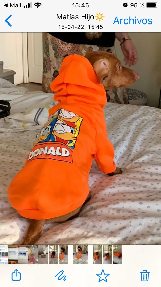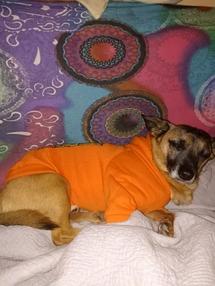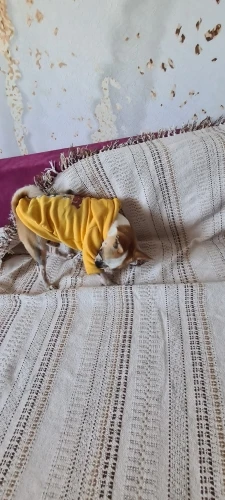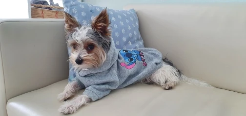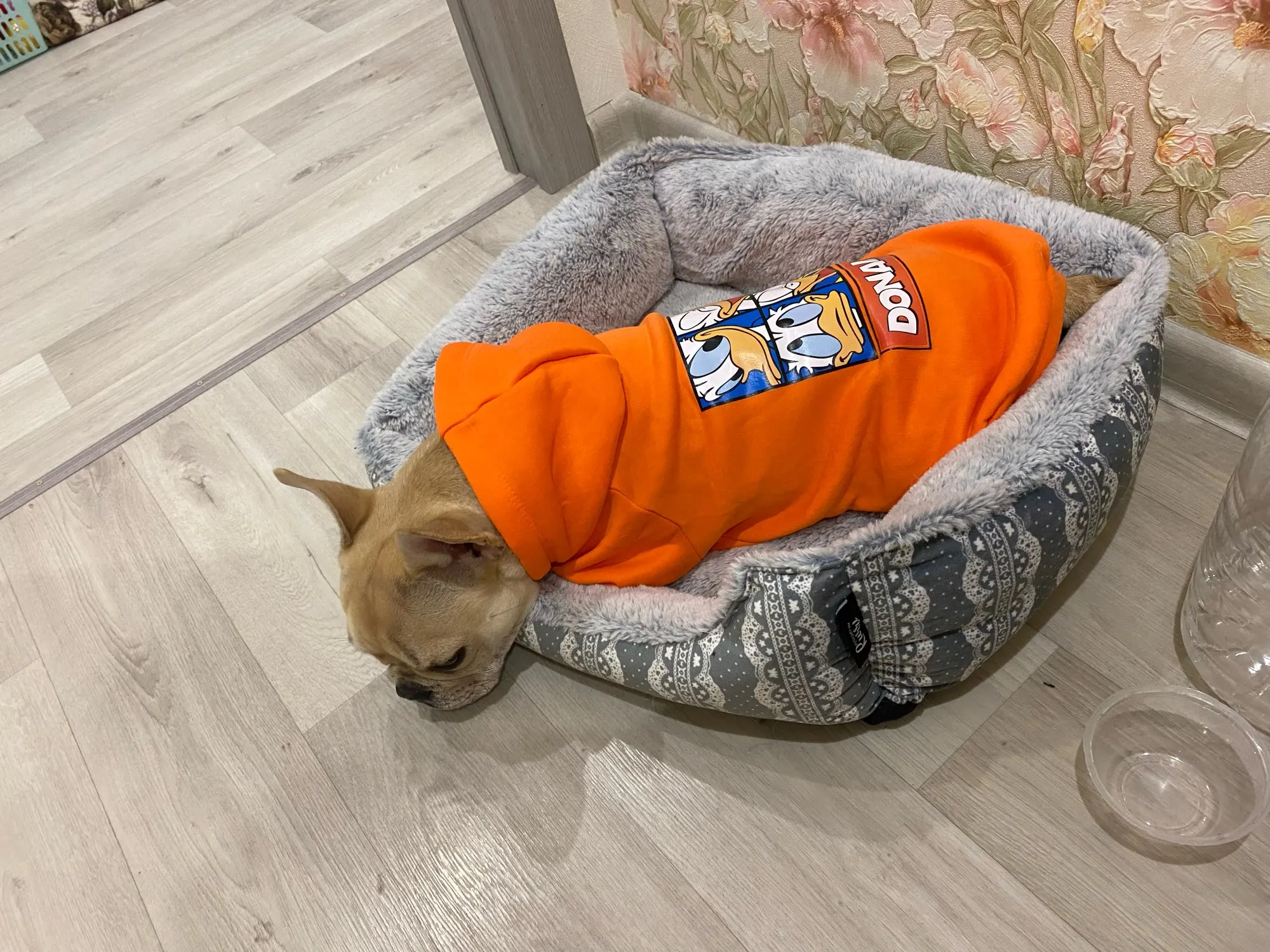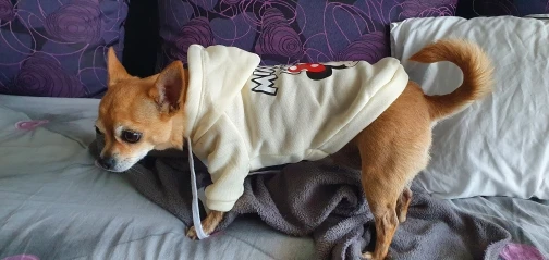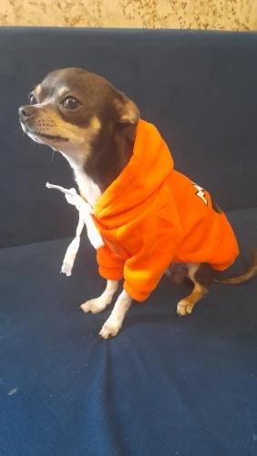 Толстовка точно такая как описано, качество на высоте, яркая, подошла по размеру, на чихуа 3 кг размер м. Рекомендую. Посылка пришла быстро.