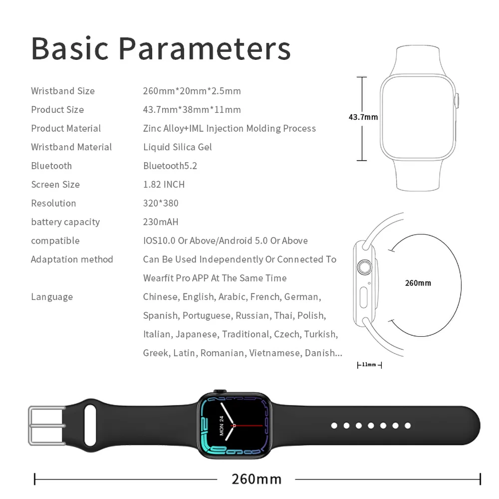 Модель: HW37 Plus Экран: 1,82 дюйма-квадратный экран Разрешение экрана: разрешение 320*380 Сенсорный экран: сенсорный экран Зарядка: Беспроводная зарядка Приложение: Wearfit pro Аккумулятор: 200 мАч Версия Bluetooth: Bluetooth 5,2 Совместимость: IOS 10,0 или выше/Android 5,0 или * выше.