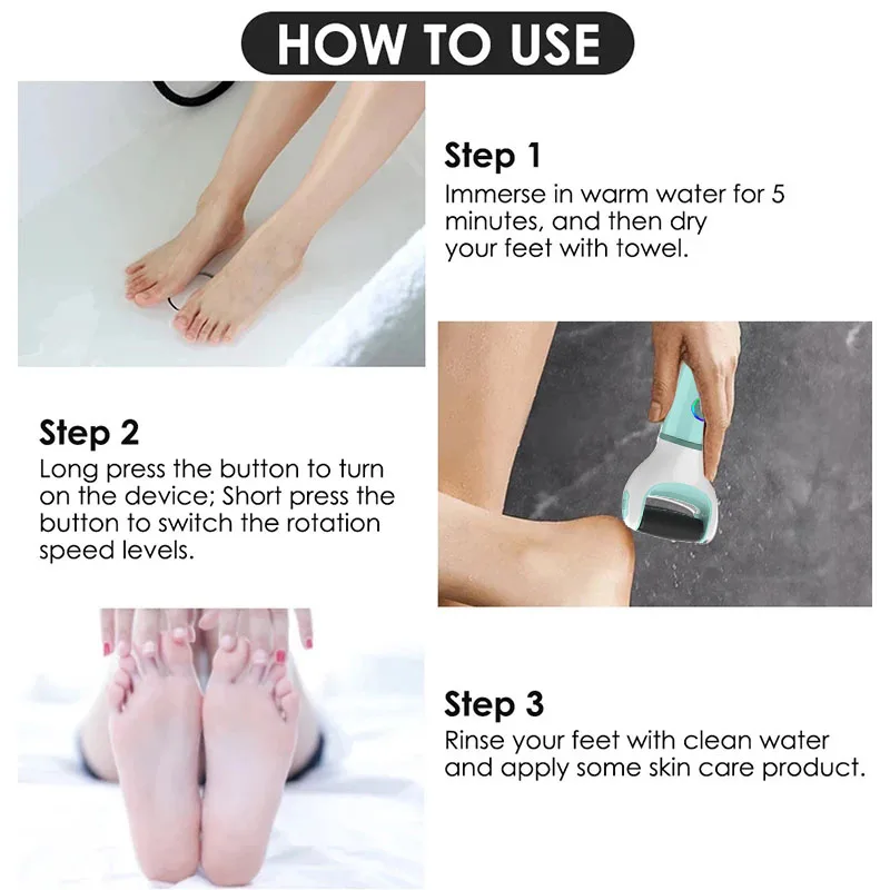 Шаг 1: храните в теплой воде в течение 5 минут, а затем высушите ноги полотенцемШаг 2: Нажмите кнопку, чтобы включить устройство; Нажмите кнопку, чтобы переключить уровни скорости вращенияШаг 3: нанесите краску на ноги чистой водой и Нанесите средство для ухода за кожей