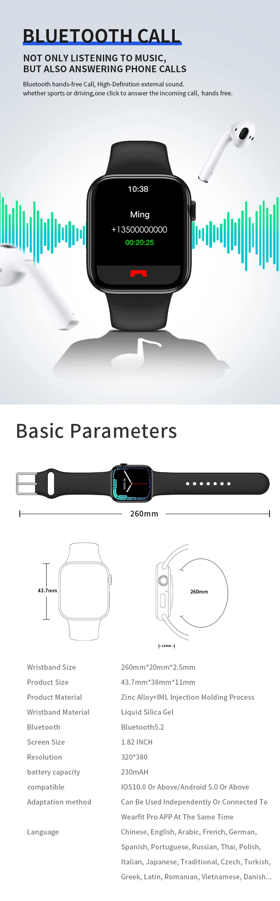 Модель: HW37 Plus Экран: 1,82 дюйма-квадратный экран Разрешение экрана: разрешение 320*380 Сенсорный экран: сенсорный экран Зарядка: Беспроводная зарядка Приложение: Wearfit pro Аккумулятор: 200 мАч Версия Bluetooth: Bluetooth 5,2 Совместимость: IOS 10,0 или выше/Android 5,0 или * выше.