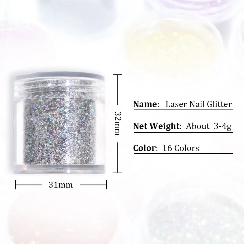 10 мл консервированных 0,2 мм ногтей лазерный порошок;Вес нетто продукта составляет около 5-6 г;Вес брутто продукта: 15-16 г;Продукт посылка Размер: 3,1*3,2 см;