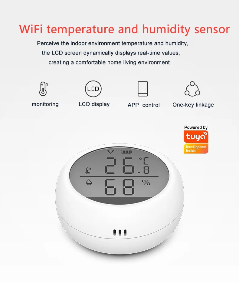 1) Wi-Fi версия датчик температуры влажности2) воспринимает температуру и влажность окружающей среды в помещении, а ЖК-экран динамически отображает значения в реальном времени для создания комфортной семейной среды обитания3) мониторинг в реальном времени изменений температуры и влажности, температура детектора является точной до десятичной точки, и блок температуры может быть установлен на Фаренгейт (°F) и Цельсия (°C)4) Дайте вашему ребенку более здоровую детскую комнату, Установите датчик в комнате ребенка, вы можете узнать изменения температуры и влажности во времени5) текущая температура/Влажность превышает установленную температуру/влажность, датчик температуры и влажности будет автоматически оповещать, приложение толкает сообщение, и датчик излучает звуковой сигнал
