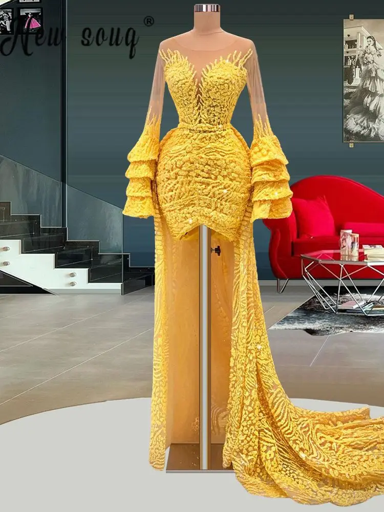 Женское вечернее платье-русалка, желтое вечерние с одним рукавом, р...