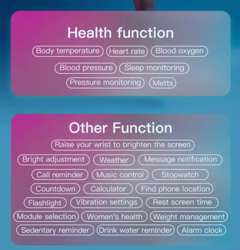 Другие функции: яркий экран, уровень яркости, погода, изменение циферблата, напоминание о сообщениях, напоминание о звонках, управление музыкой, секундомер, обратный отсчет, калькулятор, мобильный телефон, фонарик, настройка вибрации, время отдыха на экране, выбор модуля, здоровье женщин, управление весом, напоминание о сидячем положении, напоминание о питьевой воде, Будильник и так далее.