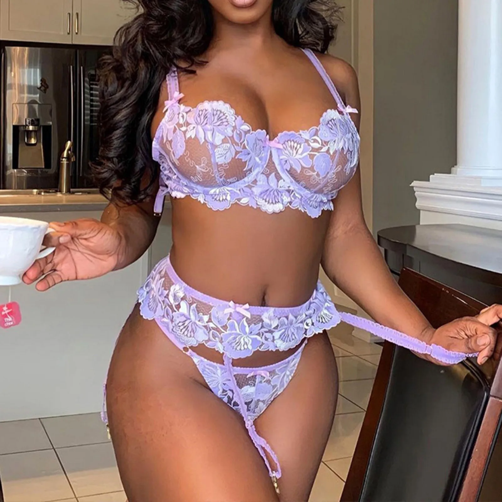 Женское сексуальное кружевное нижнее белье, женское нижнее белье с цветочной вышивкой, фиолетовые эротические костюмы, экзотические комплекты, бюстгальтер, стринги, подвязки