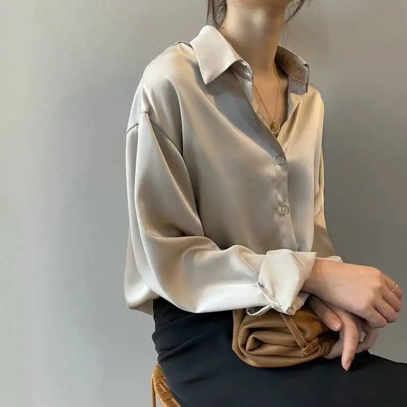 Однобортная женская рубашка с отложным воротником, свободная атласн...