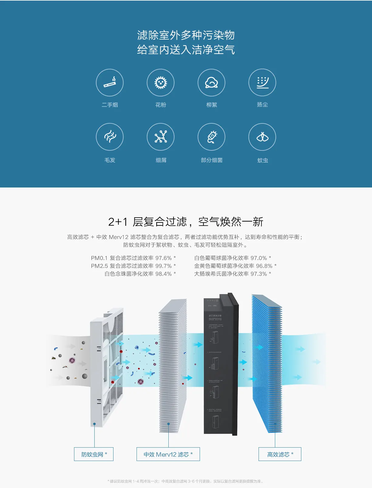 -Эффективный фильтр H13 класса HEPA + фильтр средней эффективности Merv12 интегрирован в Композитный фильтр. Две функции фильтра имеют дополнительные преимущества для достижения баланса жизни и производительности. Москитная сетка может легко блокировать на открытом воздухе для floc, комаров и волос.