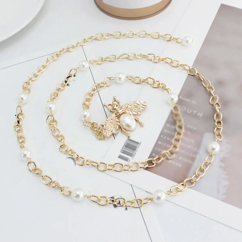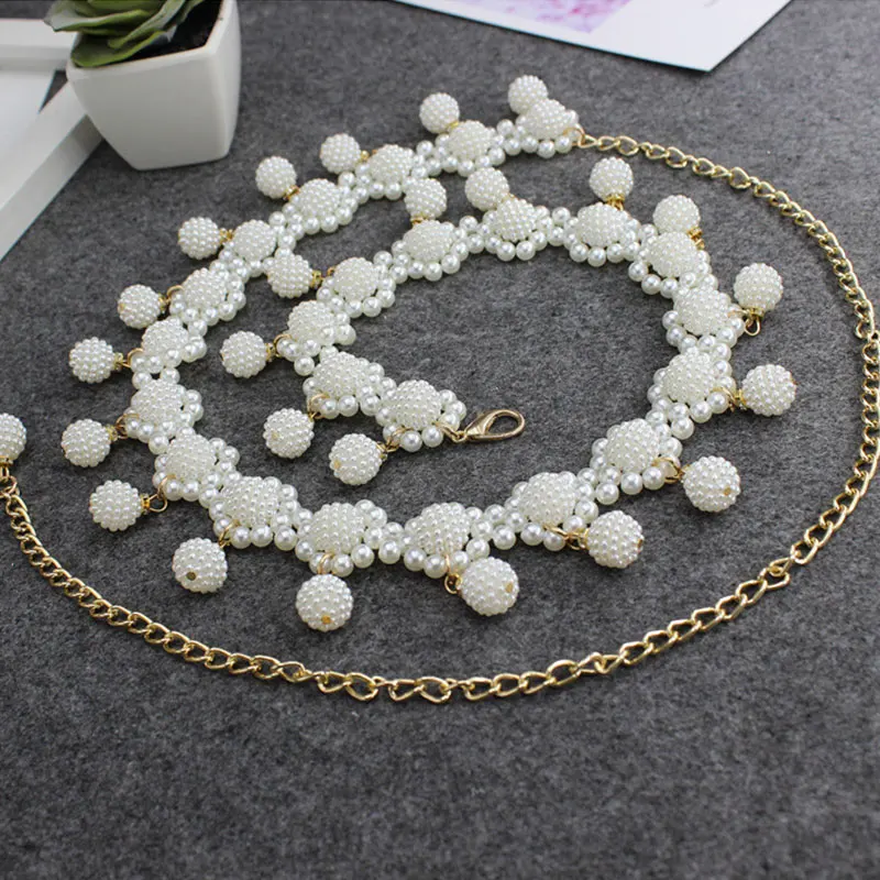 Женский тонкий ремень с бусинами пояс с жемчугом, металлическая цеп...
