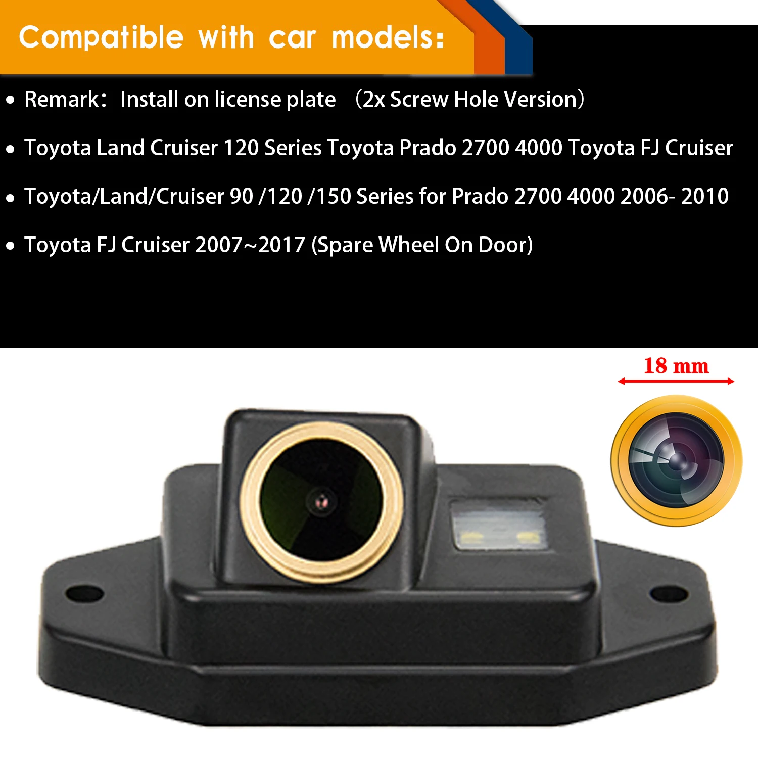 Примечание: установка на номерной знак (версия отверстия 2x)Toyota Land Cruiser 120 серия Toyota Prado 2700 4000 Toyota FJ CruiserToyota Land Cruiser 90 120 150 серия для Prado 2700 4000 2006- 2010Toyota FJ Cruiser 2007 ~ 2017 (запасное колесо на двери)