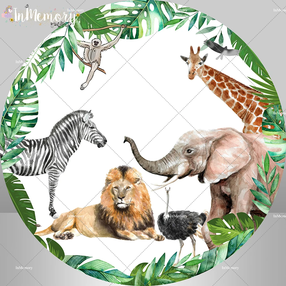 Джунгли дикие день рождения Круглый фон зеленая трава листья Декор слон лев круг крышка Фотофон