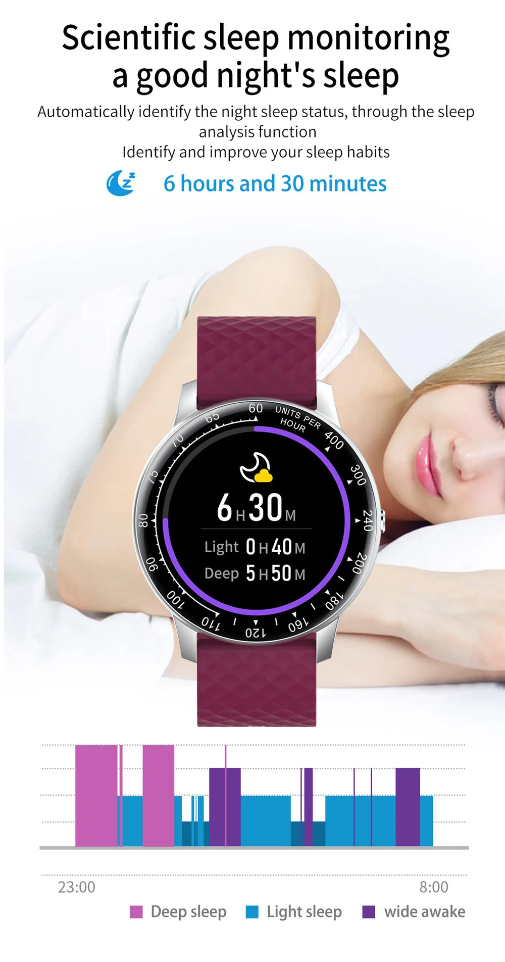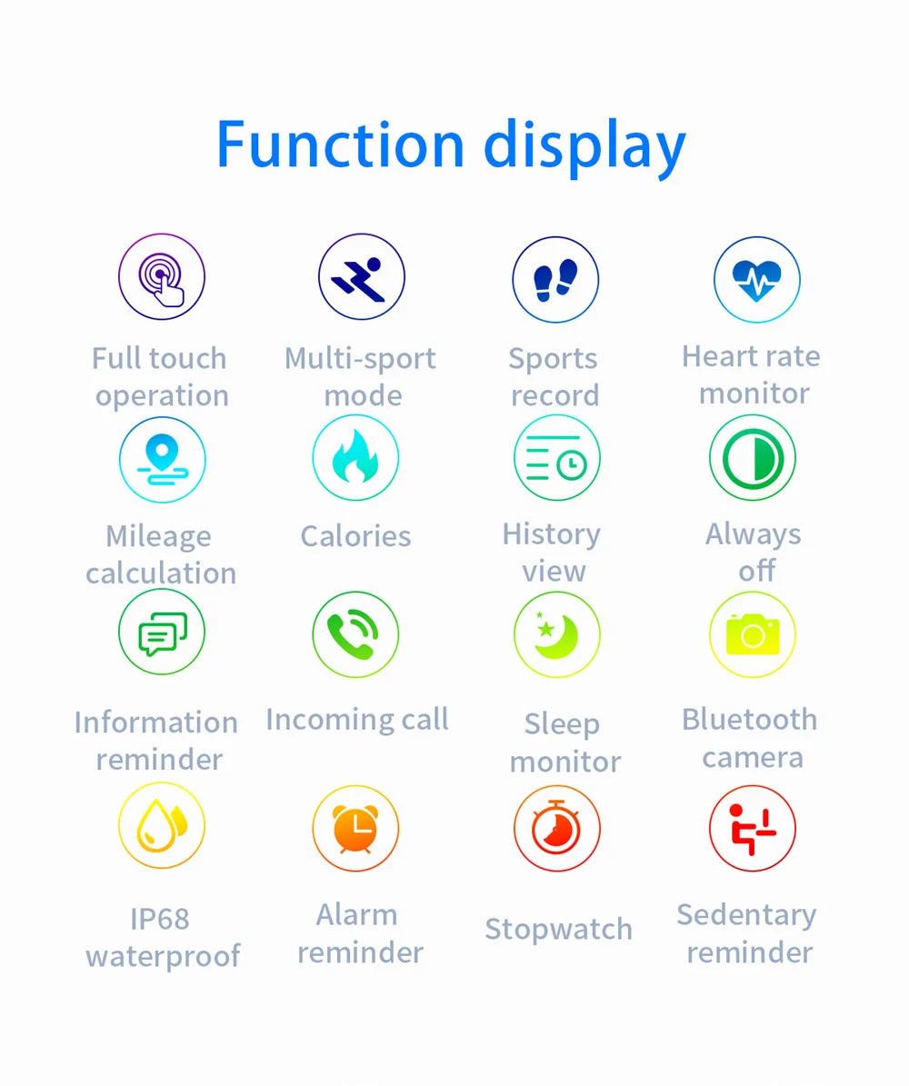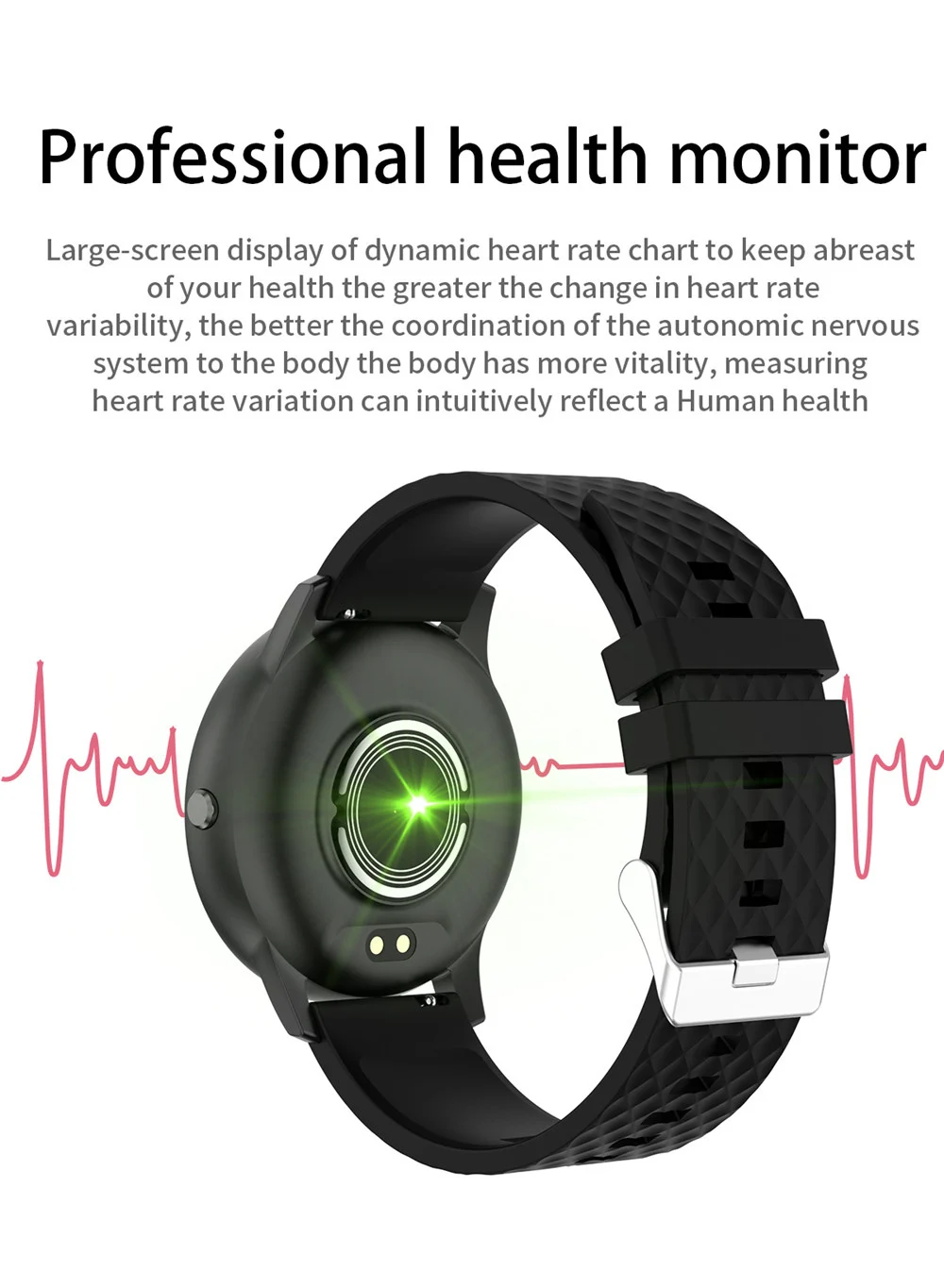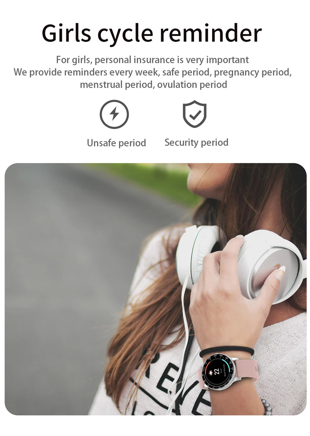 1,28 дюймовый полный сенсорный круглый экранМожно настроить 5 обоевНапоминание о менструальном циклеВодонепроницаемость: IP68Монитор сердечного ритмаМонитор артериального давленияМонитор кислорода в кровиМонитор снаМульти-спортивные режимыШагомерНапоминание о звонке или сообщенииОтображение идентификатора вызоваИнформация Push напоминание (SMS/QQ/WeChat/Skype/Facebook/Twitter/Line/WhatsApp)Погодный толчокУправление музыкойАвтоматический светильник-экранТип оповещения: вибрацияСекундомерДругие функции: будильник, напоминание о сидячем положении, дистанционное управление камерой, защита от потериНазвание приложения: AdorHealth