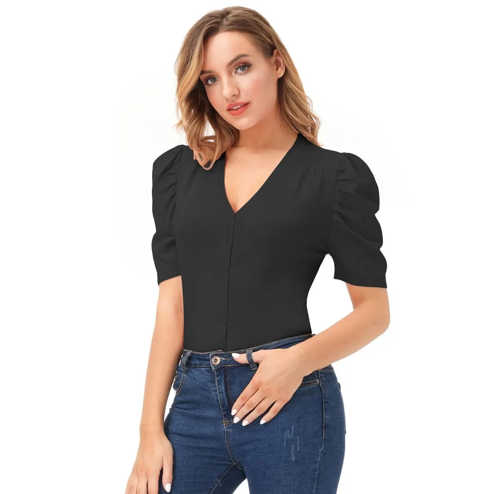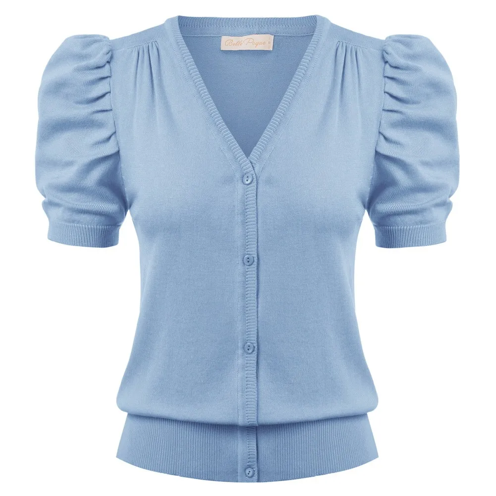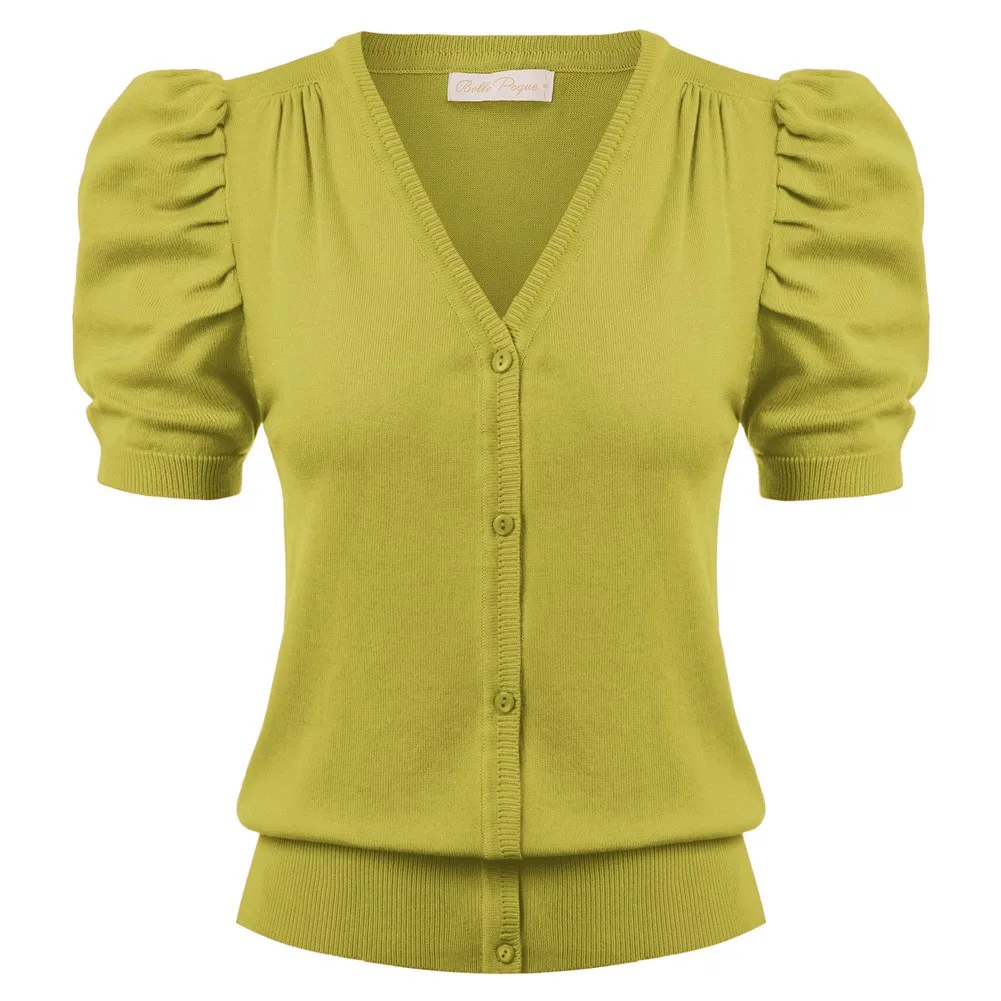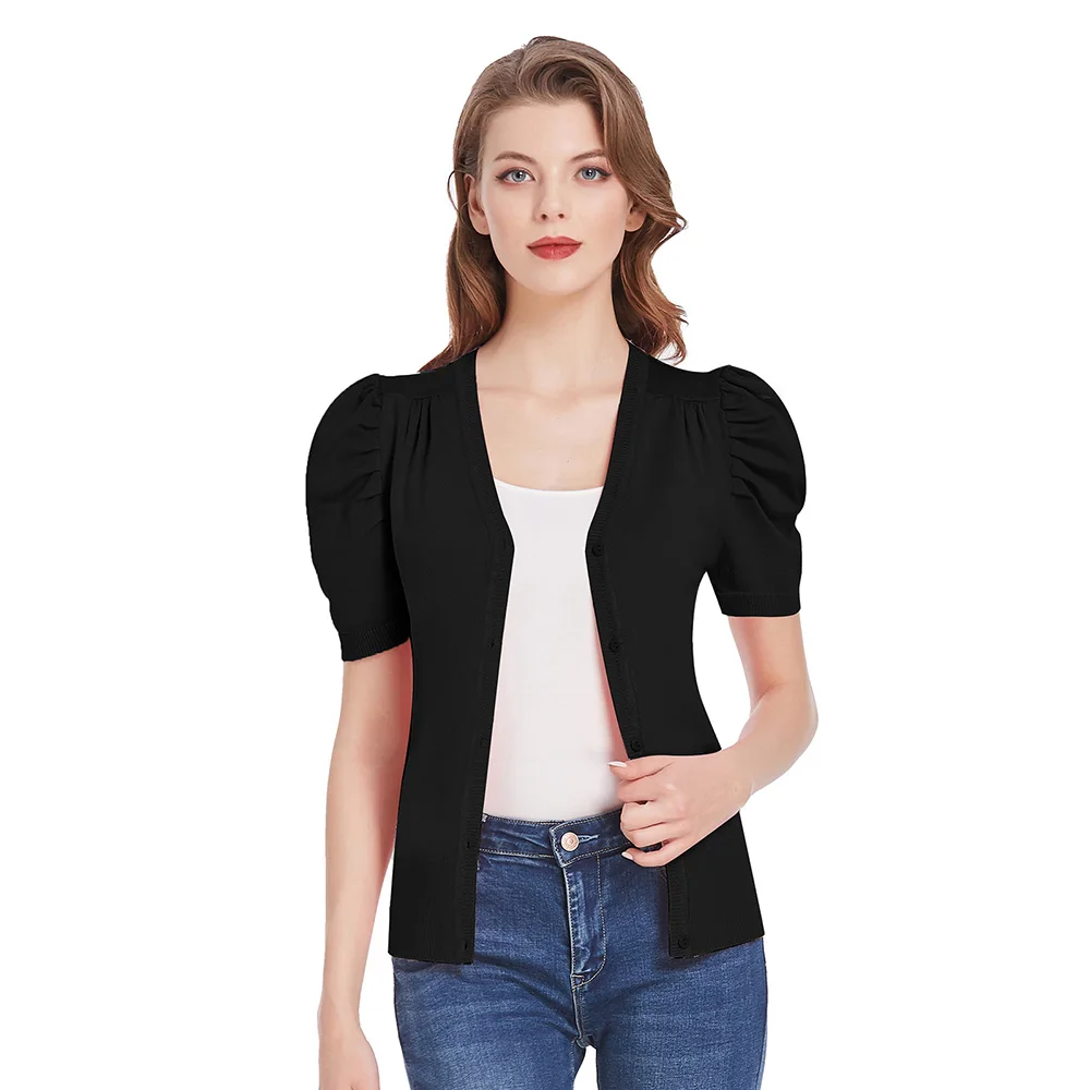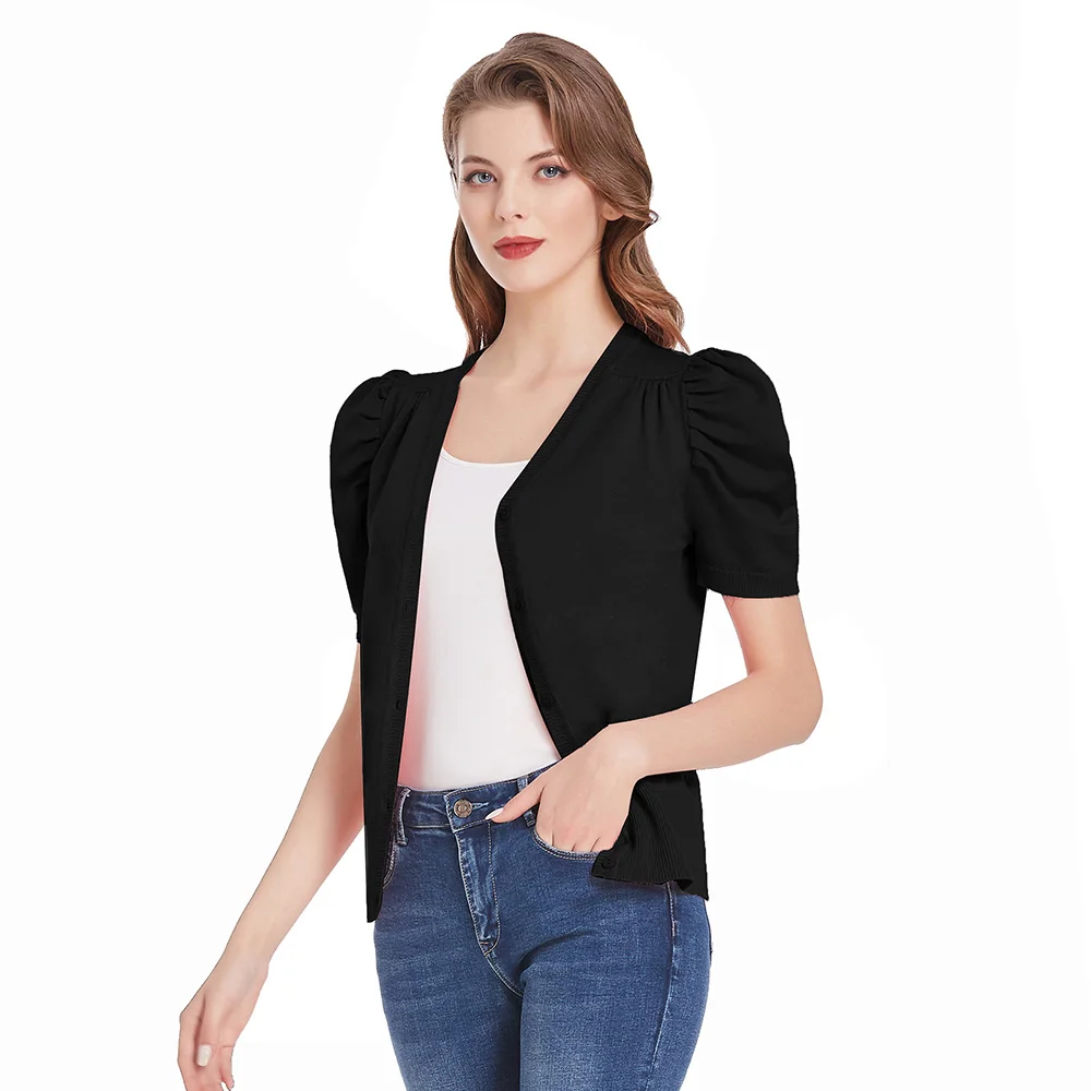 Женский трикотажный кардиган с коротким рукавом-фонариком и V-образным вырезом