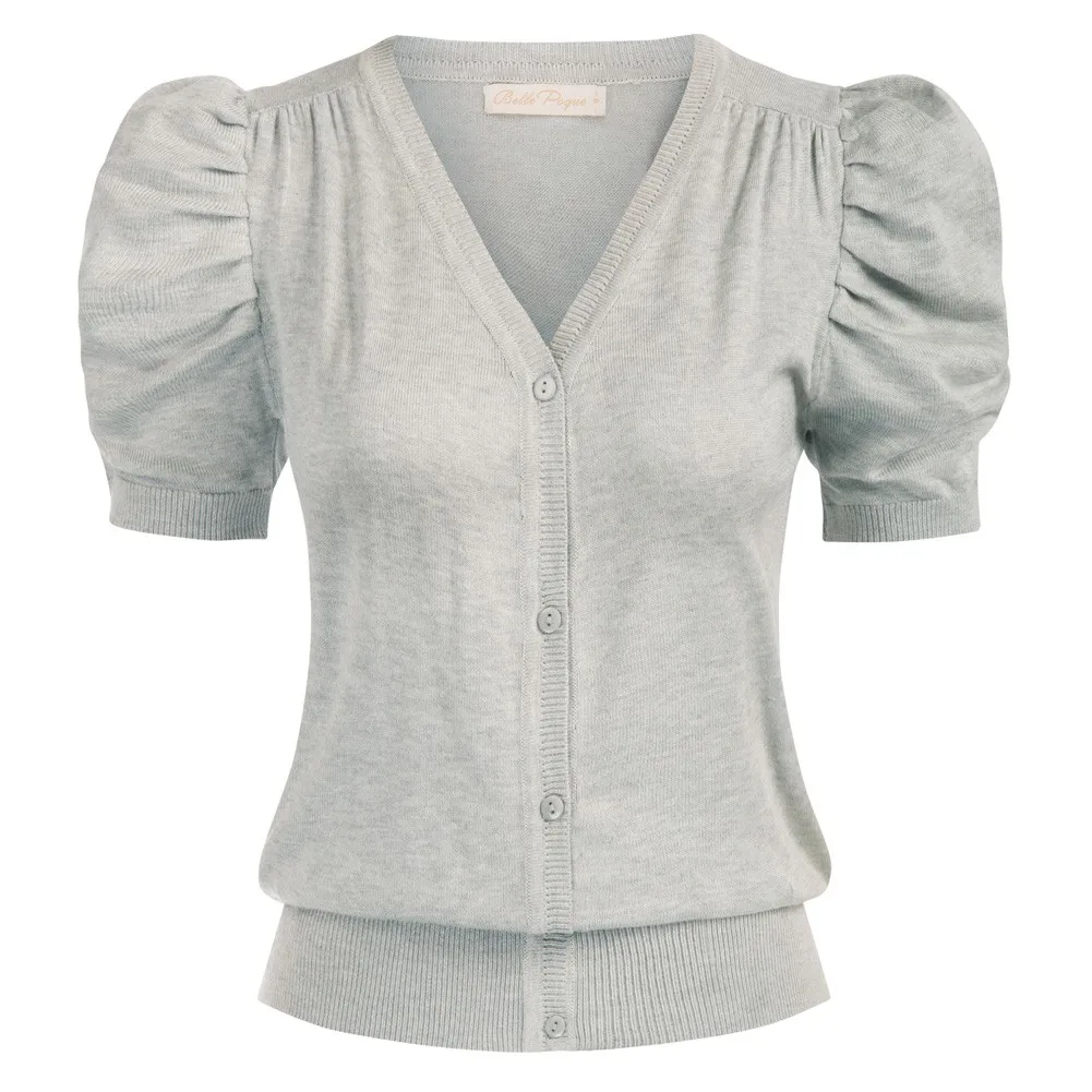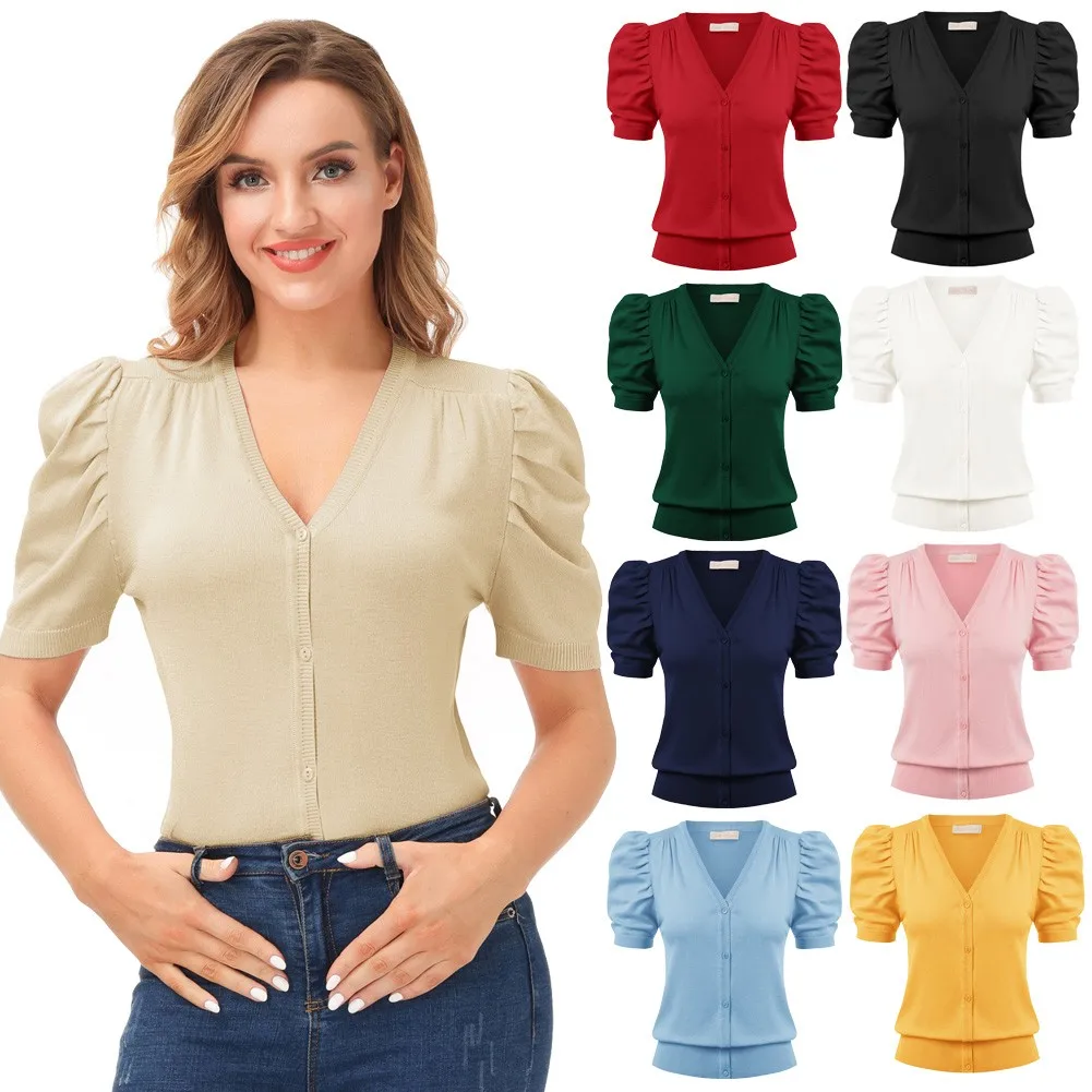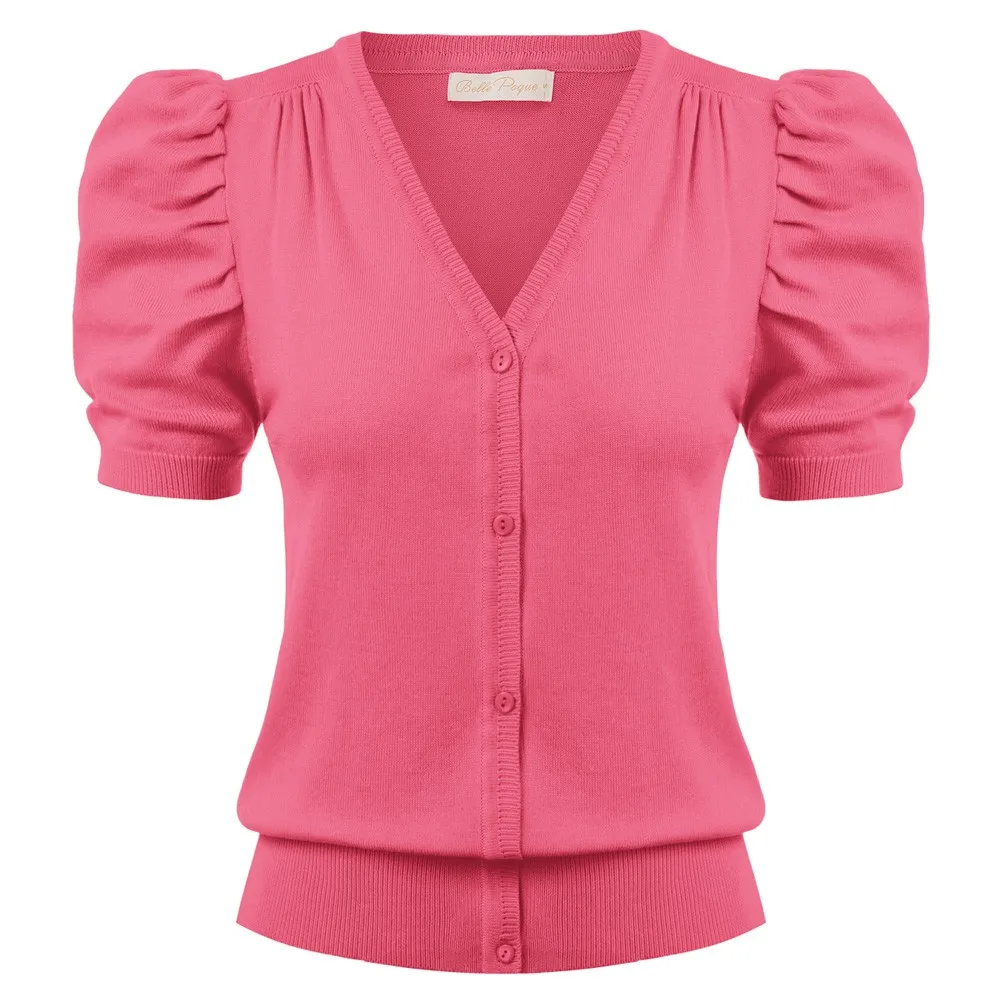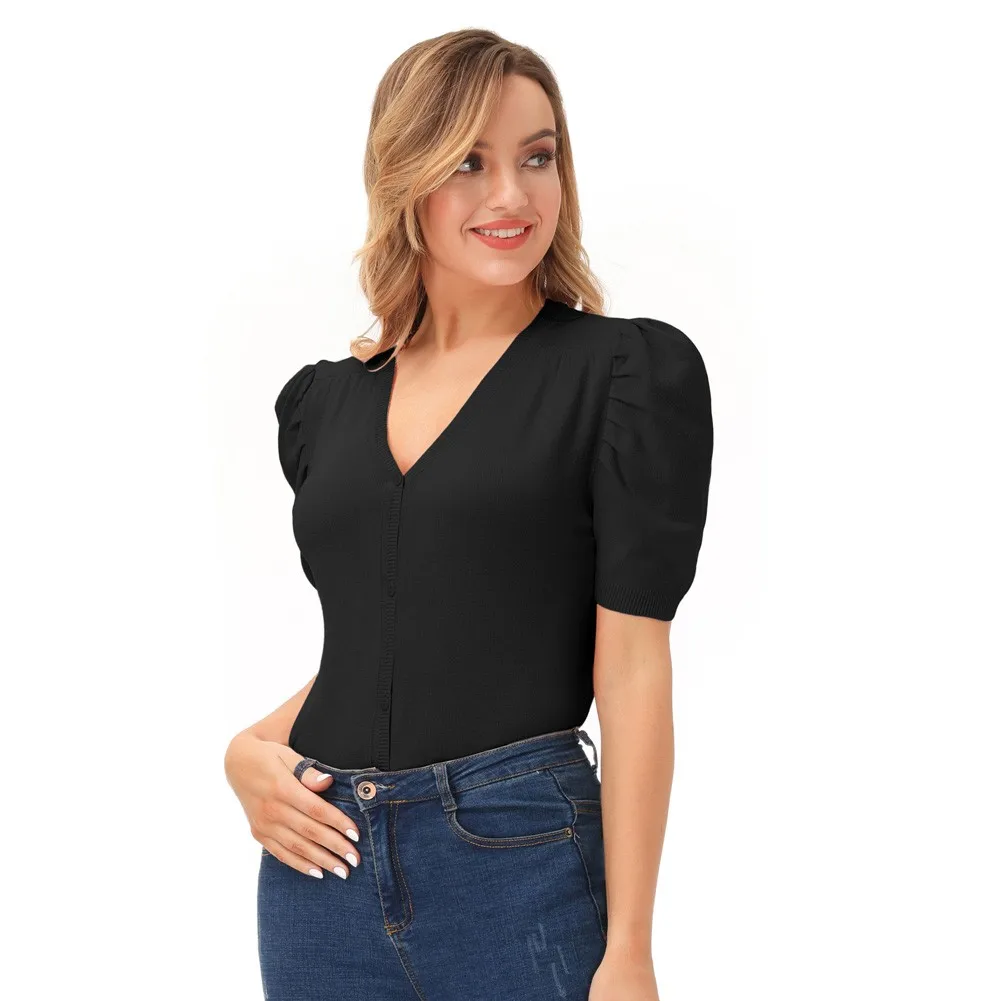 Женский трикотажный кардиган с коротким рукавом-фонариком и V-образным вырезом