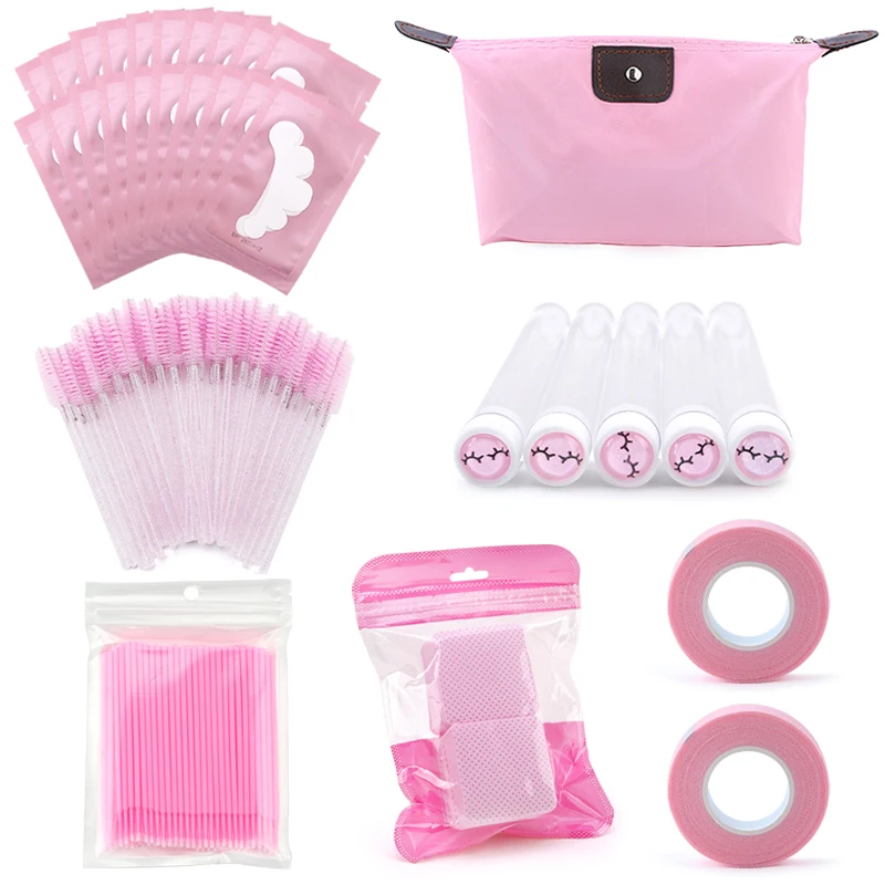 Набор для наращивания ресниц, розовая сумка для макияжа, микрощетка, кисти для ресниц, туба, тушь для ресниц, палочки под глазами, патчи, лента, набор косметики