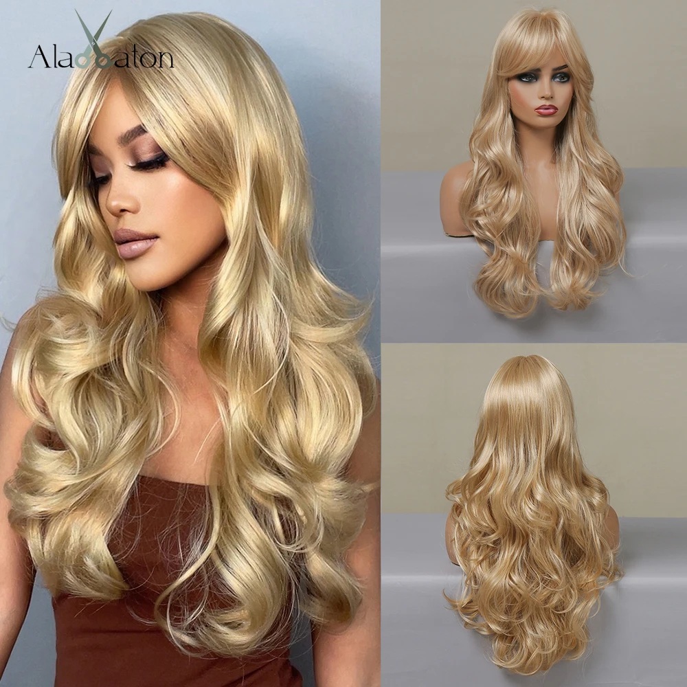 Длинные золотые парики ALAN EATON, волнистые синтетические парики с челкой для белыхчерных женщин, натуральный косплей, вечевечерние, ежедневный, термостойкий