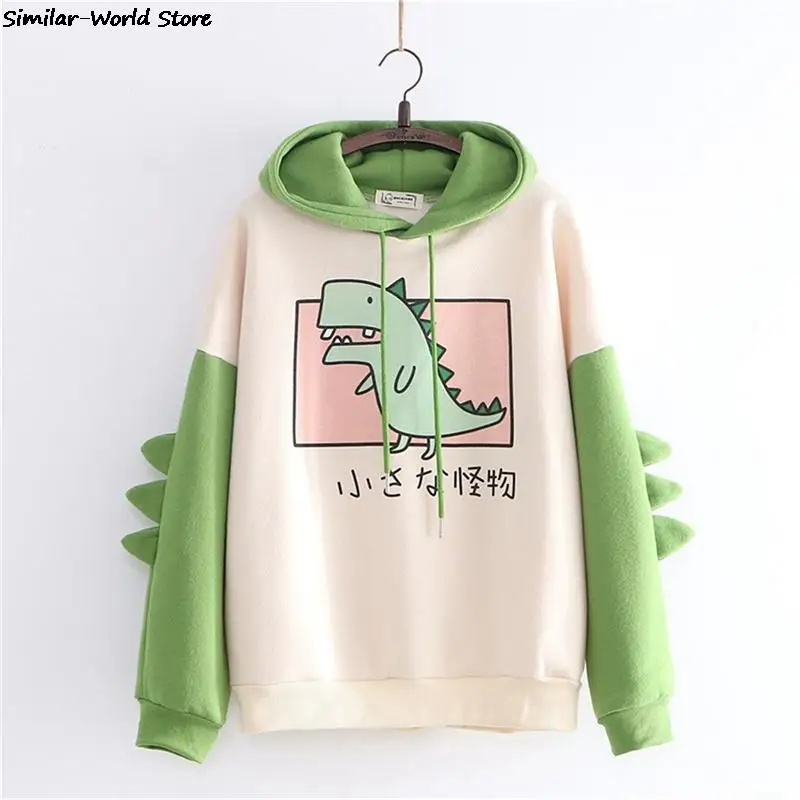 Толстовка Женская с динозавром, Модный свитшот в стиле оверсайз, утепленная кофта в Корейском стиле, повседневный зимний худи с динозавром