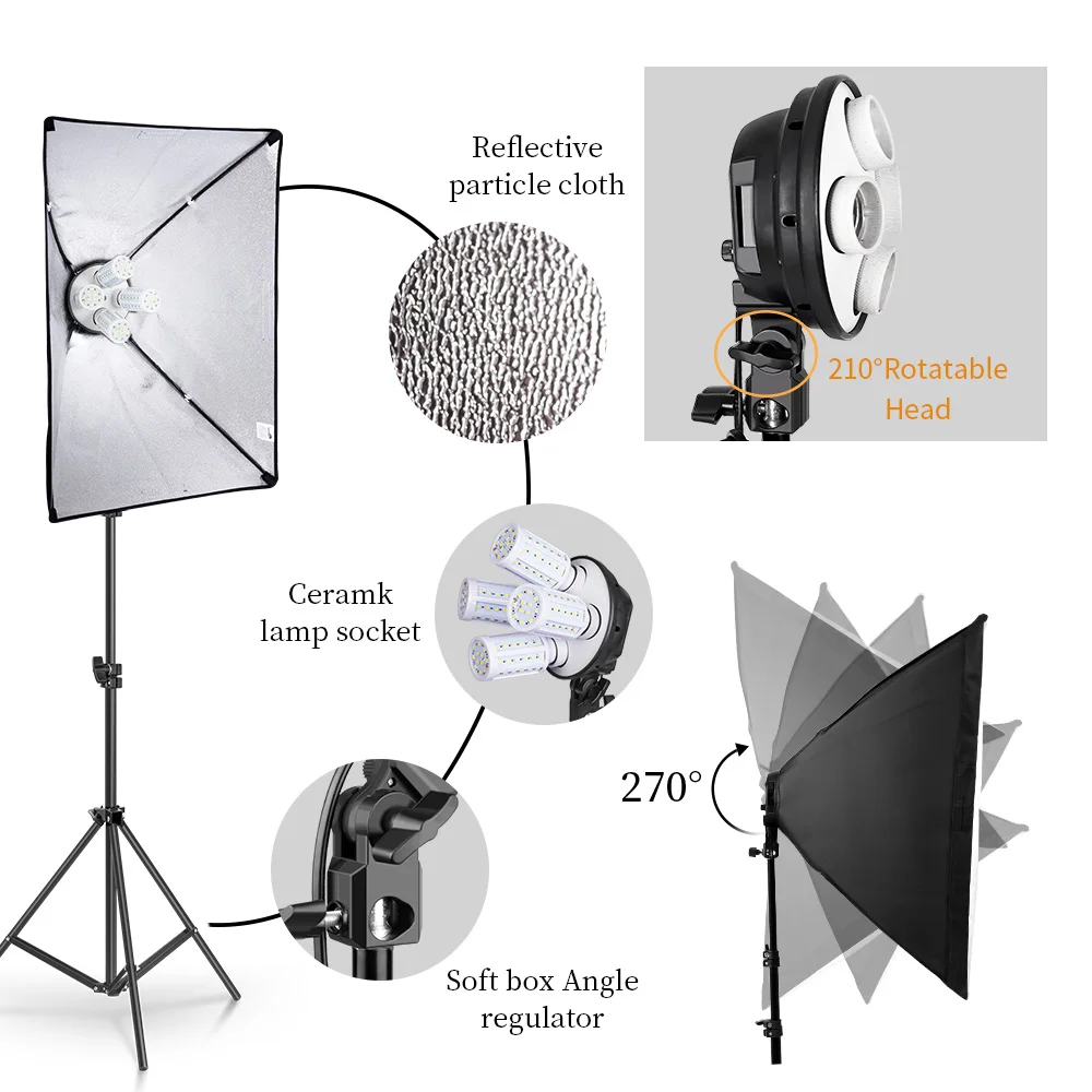 Это идеальный набор софтбоксов для цифрового фото-и видеосъемки.Четыре держателя лампы: сочетаются с 4 лампами, Цоколь E27 подходит для большинства осветительных приборов.Четыре вида адаптера питания: штепсельная вилка европейского стандарта, штепсельная вилка американского стандарта, штепсельная вилка британского стандарта, штепсельная вилка австралийского стандарта на выбор.50x70 софтбокс: белая Складная мягкая ткань, Высококачественная Светоотражающая частица. Безопасное и нетоксичное полиэфирное волокно, 4 гибких соединительных стержня.Подарите 1 дополнительный предохранитель (чтобы предохранитель не горел из-за чрезмерного рабочего времени)