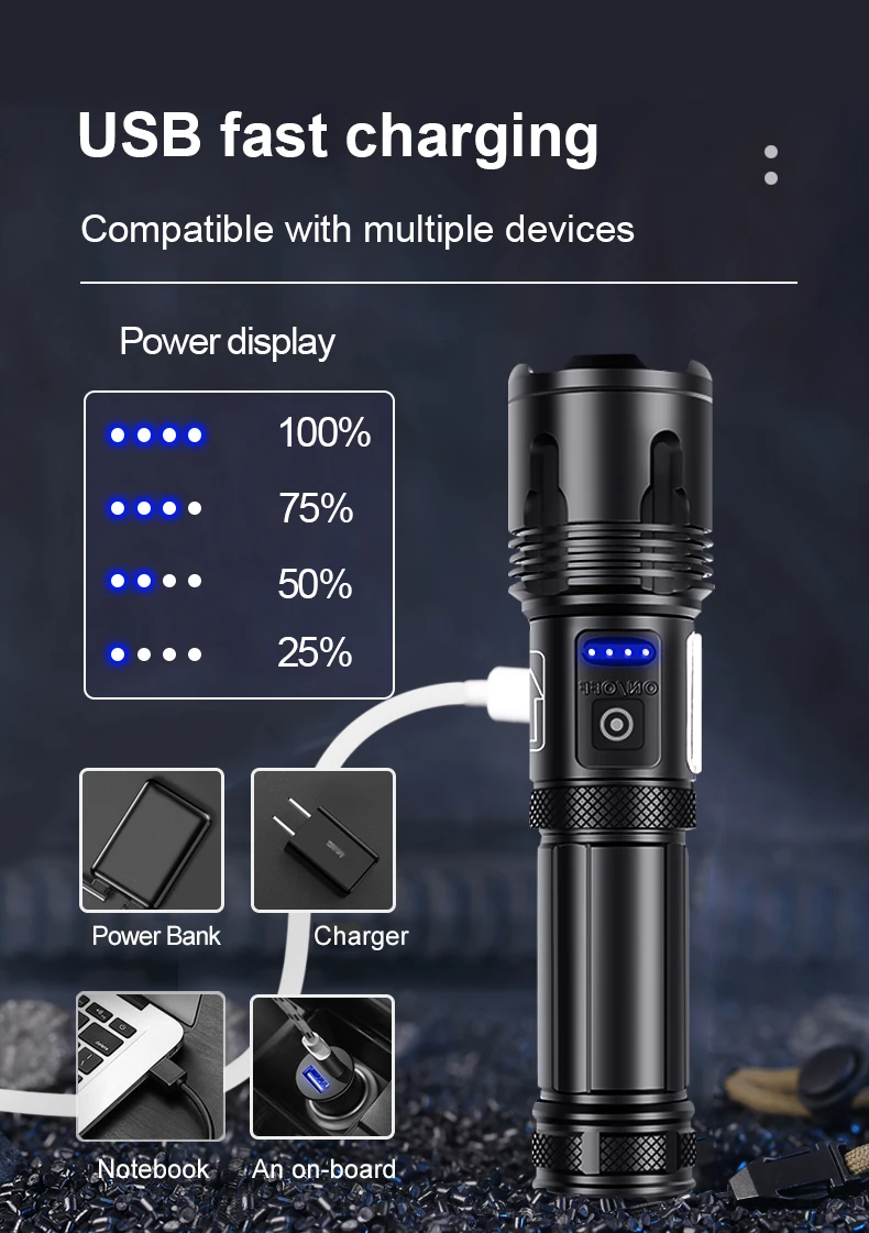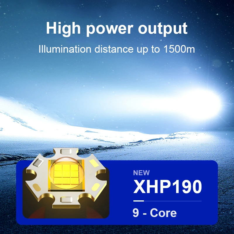 XHP190 описание продукцииНовый многофункциональный смарт-фонарик XHP190, 7 режимов для удовлетворения всех ваших потребностей, яркость до 1000ЛМ, внутреннее использование умного фитиля XHP190 и Высокоэффективная повышающая цепь позволяют использовать фонарик лучше, лучший выбор для активного отдыха и домашнего освещения!