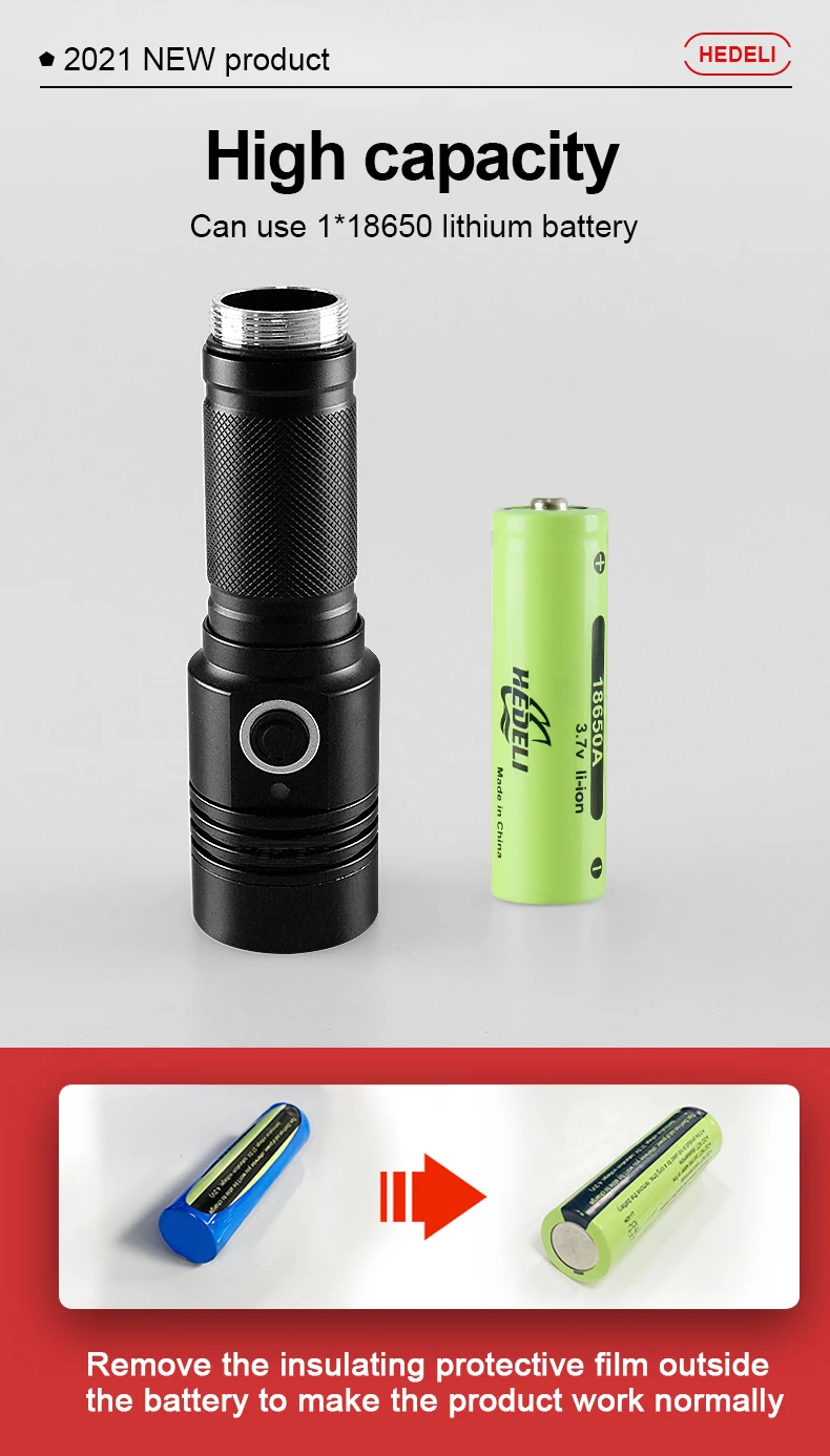 • Светодиодный светильник: светодиодный XHP190• Размеры: 18 см * 4,3 см * 3,5 см• Материал: авиационный алюминиевый сплав• Световой диапазон: 800-1800 м• Цвет излучения: белый светильник и красный светильник• Водонепроницаемость: IPX-8• Батарея: 18650 или 26650• Зарядное устройство: Micro-зарядное устройство USB• Время зарядки: 6 часов• Время освещения: 4-10 часов• Дисплей батареи: 100%-75%-50%-25%• Функция внешнего аккумулятора: может быстро зарядить телефон