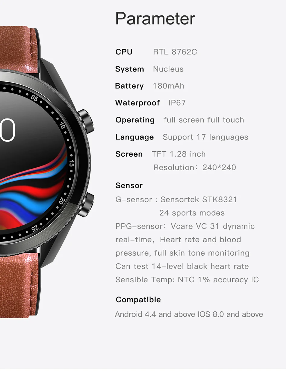 Использует большой дисплей 1,28 дюйма, более крупные слова, более четкие, высокочувствительныеT-ouchЭкран может достигать различных операций, напоминания о смарт-звонках, шагов, калорий, мониторинга сна, Bluetooth музыки, пульса, быстрого просмотра различных функций и т. Д.Et-ouchРабота большого цветного экрана более гладкая, и умная жизнь начинается с тех пор.
