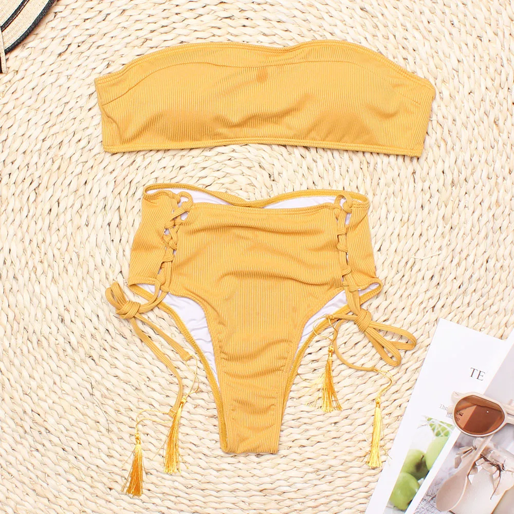 Желтый однотонный комплект бикини с высокой талией и бахромой, купальник, сексуальный купальник из двух предметов, новинка 2022, пляжные купальные костюмы
