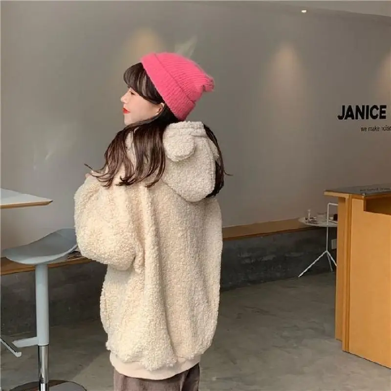 Плюшевая толстовка из ягненка, женское теплое пальто с медвежьими ушками, новинка на осень и зиму, милая Повседневная Свободная бархатная Толстая куртка в стиле преппи