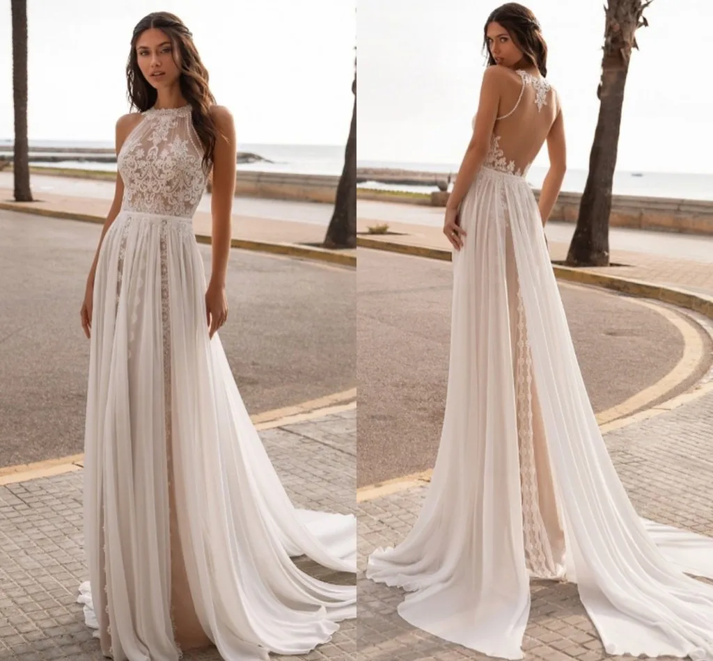 Свадебное платье 2022 богемные кружевные шифоновые пляжные платья без рукавов с открытой спиной со шлейфом для невесты свадебное платье Robe De Mariee