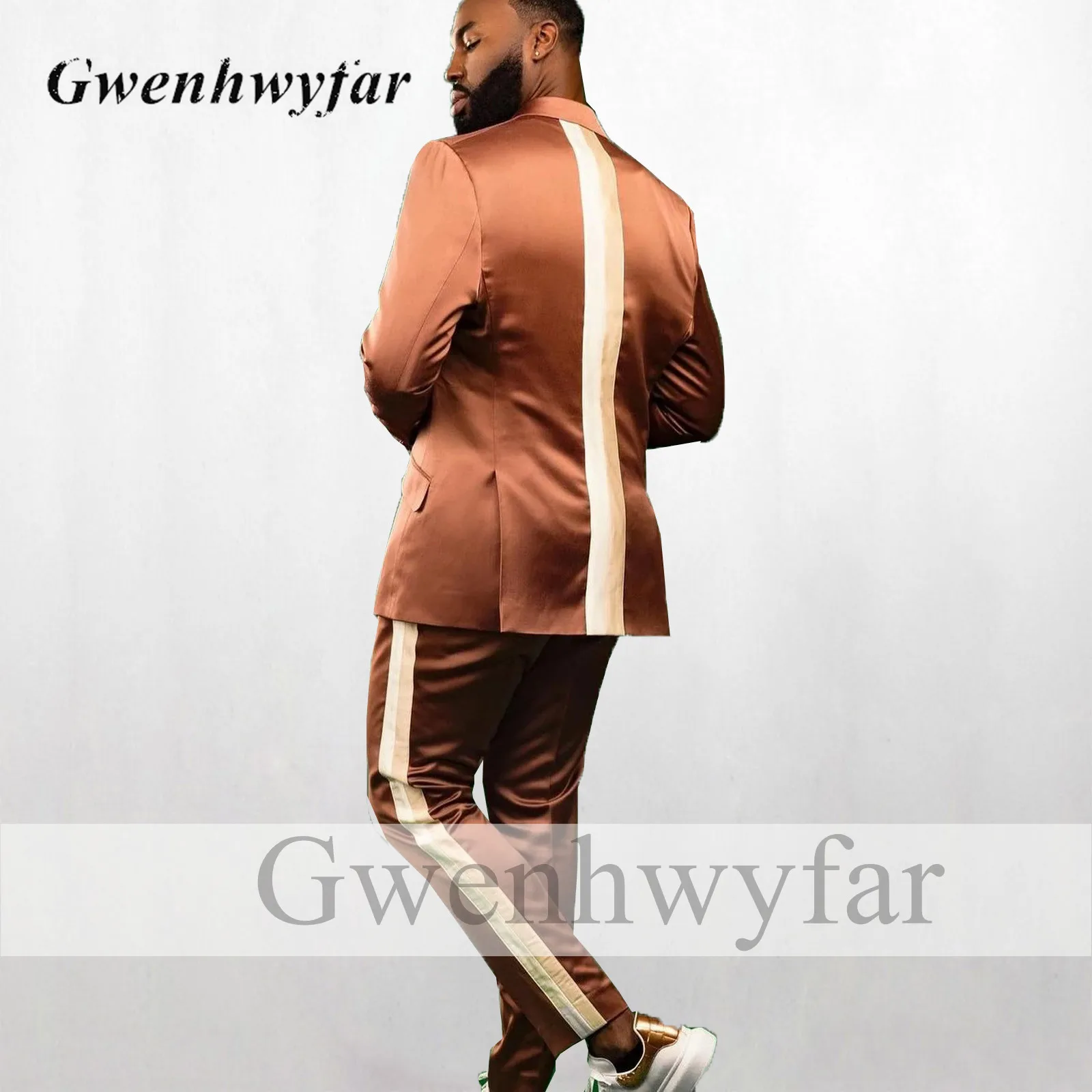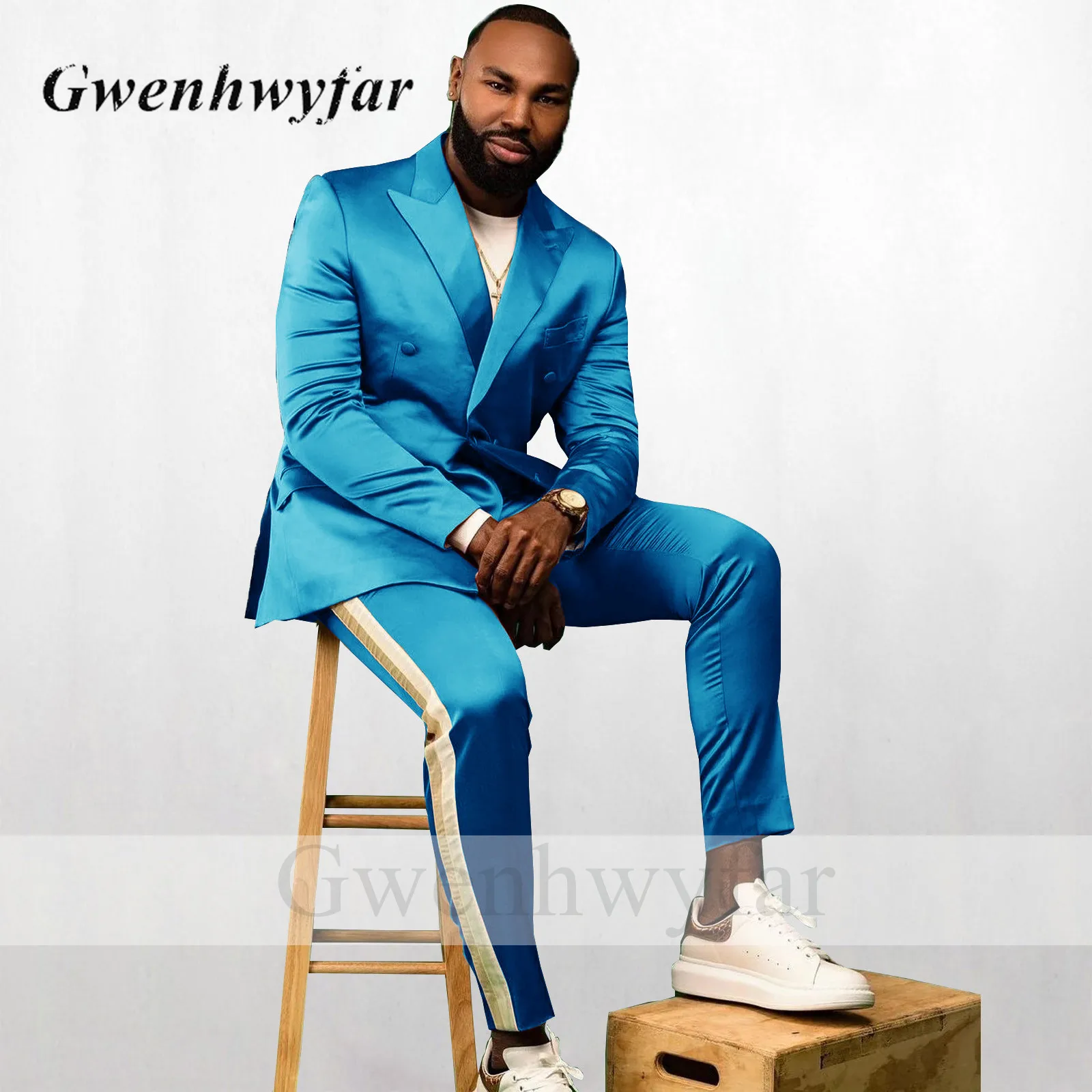 Блестящие мужские смокинги Gwenhwyfar светло-голубого цвета, 2022, двубортный свадебный костюм для жениха, Блейзер, брюки с модной окантовкой сзади