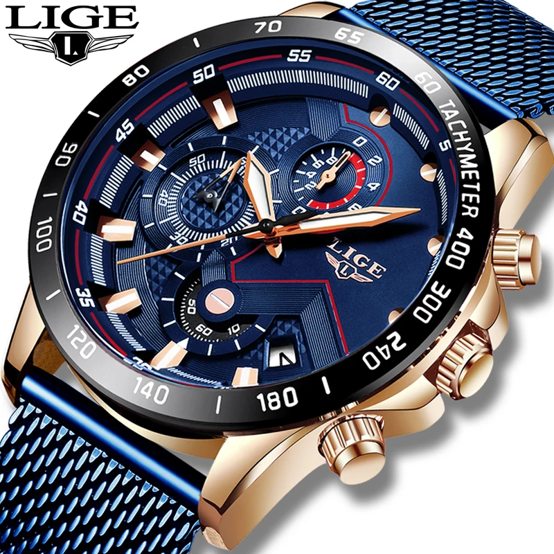 LIGE мужские модные синие часы для мужчин Топ бренд Роскошные кварцевые мужские часы сетка водонепроницаемый спортивный хронограф Relogio Masculino + коробка