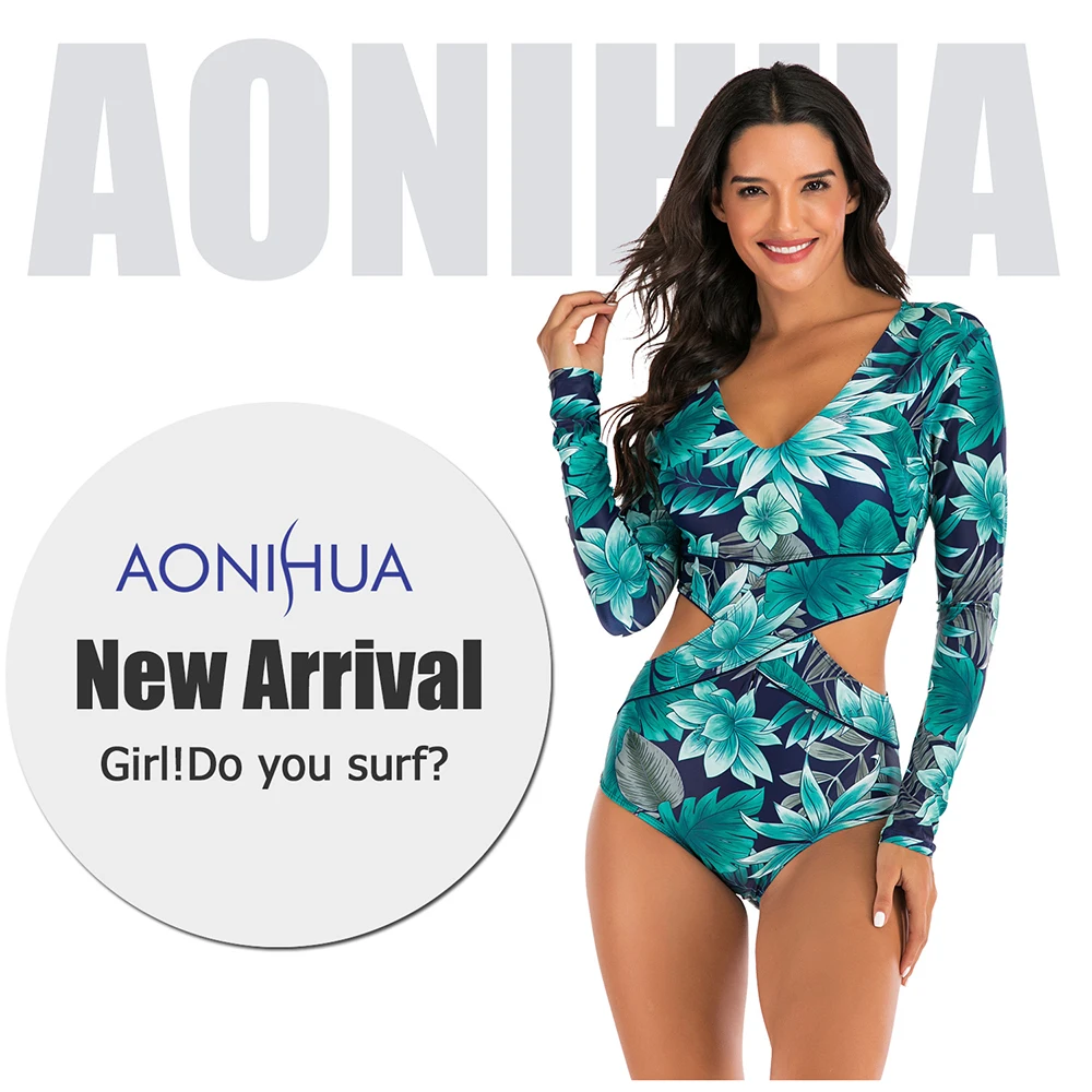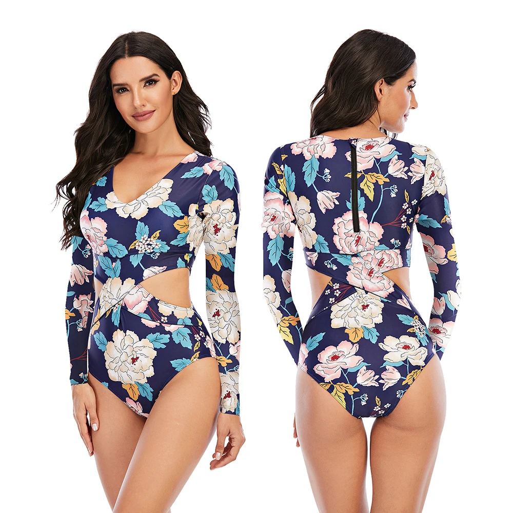Женский купальник с длинным рукавом, солнцезащитный, быстросохнущий, УФ, UPF 50 +, с принтом, сексуальный, пляжный, для серфинга, Цельный купальник, гидрокостюм