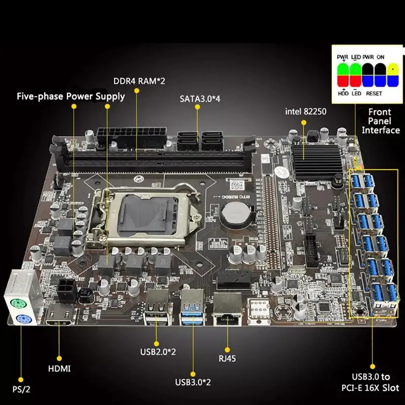 Интерфейс USB3.0: мгновенно испытайте скорость передачи данных в 10 раз быстрее, чем USB2.0 через функцию plug and play.Поддержка емкости памяти 16 Гб, значительно повышает производительность материнской платы.Тепловыделение высокой энергии, не боится высокой температуры, увеличения, сильной конструкции тепловыделения, чтобы обеспечить полную скорость работы процессора. Характеристики:Наименование товара: материнская плата для горнодобывающей машины BTCЦвет: черныйМатериал: PCB + металлРазмер: 23*18,5 смМодель продукта: B250 BTC 12PПроцессор: поддерживает все процессоры серии LGA1151Набор микросхем: с использованием высокоскоростного чипсета Intel B250Память: 2 * DDR4 DIMM слот памяти поддерживает память 2133/2400 МГц, максимальная поддержка 16 ГбЧип дисплея: графическая карта Intel HD Graphics coreВыход Дисплея: HDMI-совместимый/12 * USB3.0 к PCI-E 16XИнтеграция сети: 1 * микросхема сети RTL8111F 100MИнтерфейс ввода/вывода:2 * USB3.0 интерфейс4 * Интерфейс USB2.01 * HDMI-совместимый интерфейс1 * RJ451 * интерфейс PS/2Встроенный интерфейс ввода/вывода1 * USB3.0 pin2 * USB2.0 pin1 * COM pin1 * F-PANEL кнопки и указатели на передней панелиBIOS: AMI 64 Мб флэш-памятьТип источника питания: поддержка ATX 24P + ATX 4P 12V + ATX 6P Примечание:-Возможны небольшие погрешности в размере при ручном измерении.-Отклонение цвета может отличаться из-за различных настроек монитора, пожалуйста, поймите.