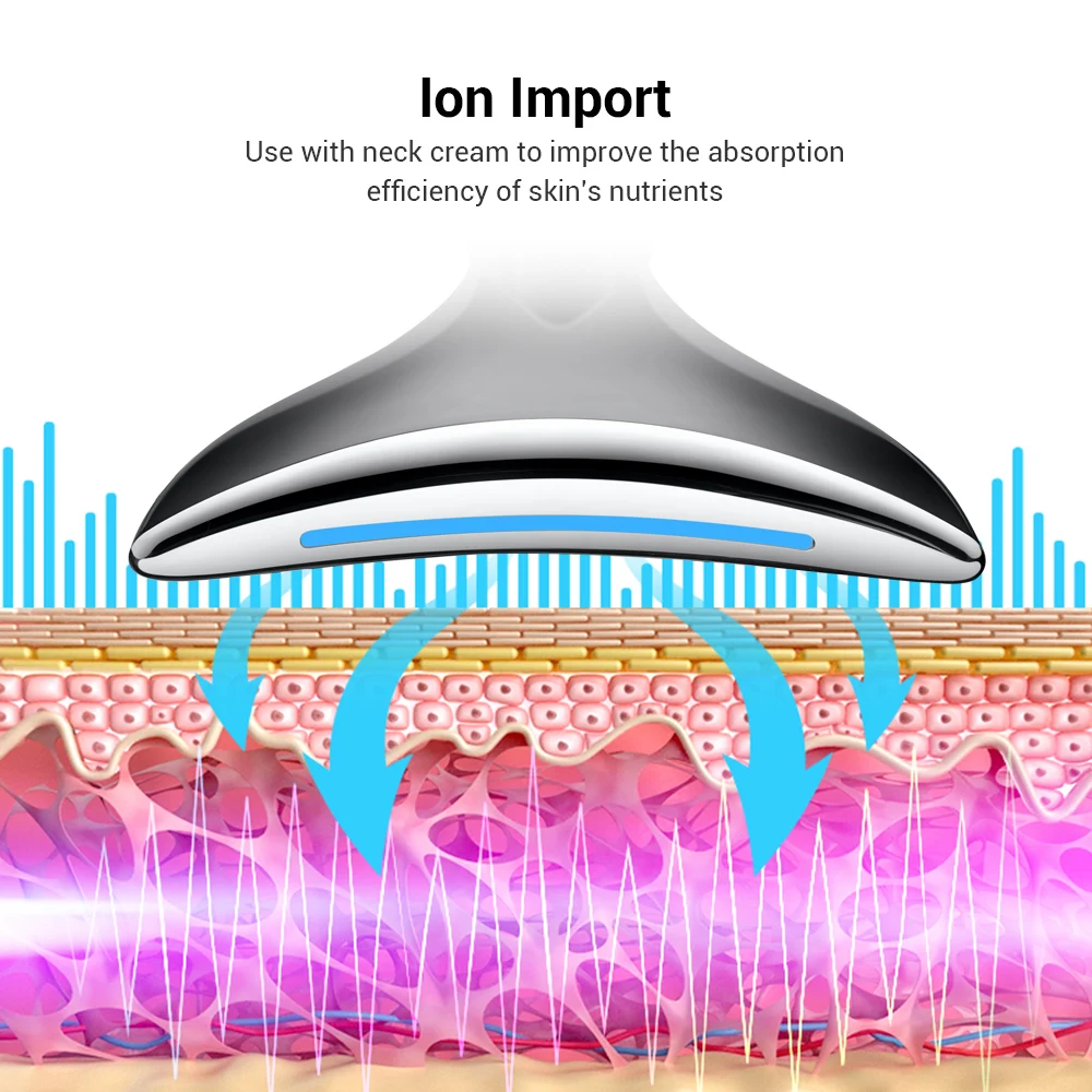 Красные, синие и фиолетовые энергетические световые волны достигают глубоких слоев кожи, чтобы повысить производство коллагена и уменьшить морщины шеи.