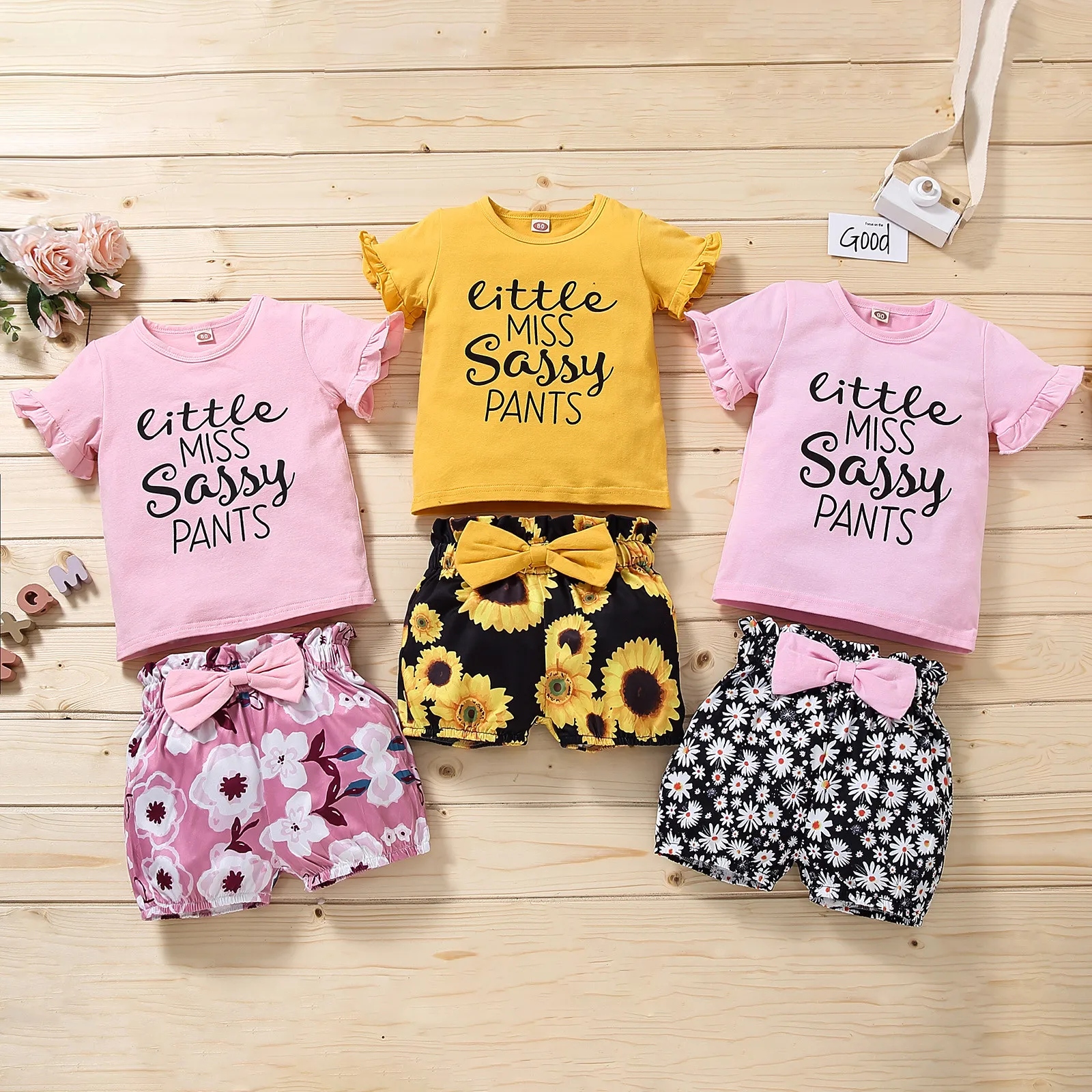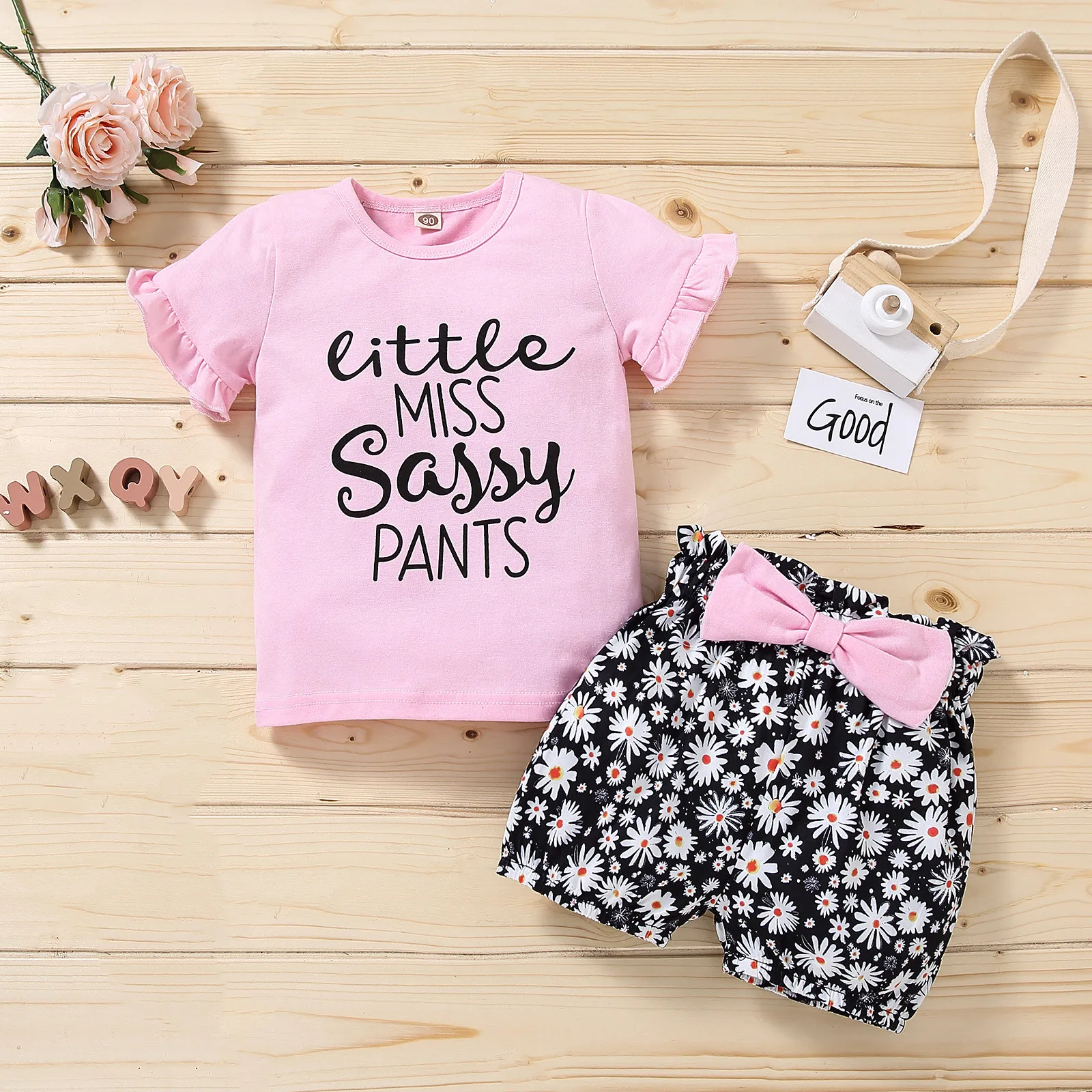 Летний костюм для девочек 1-3 лет, футболка с оборками и шорты с цветочным принтом